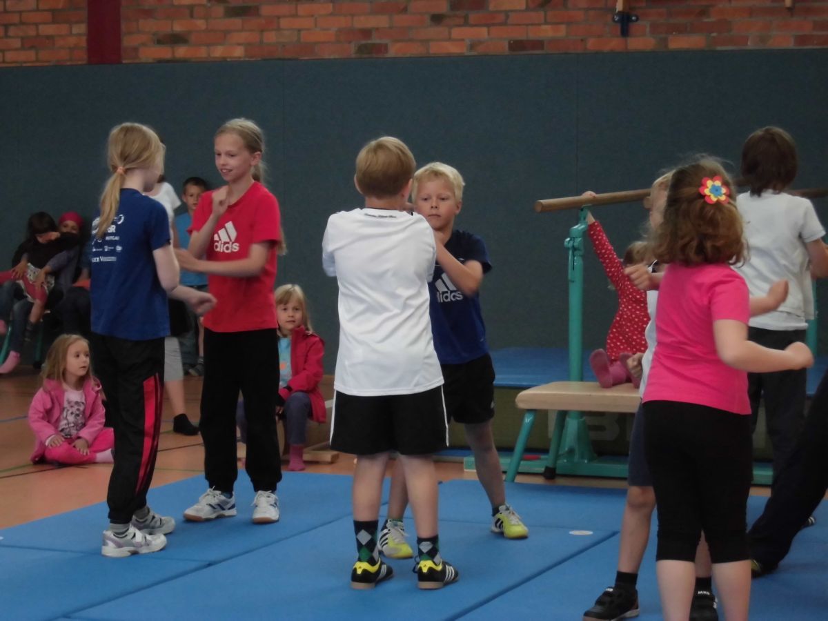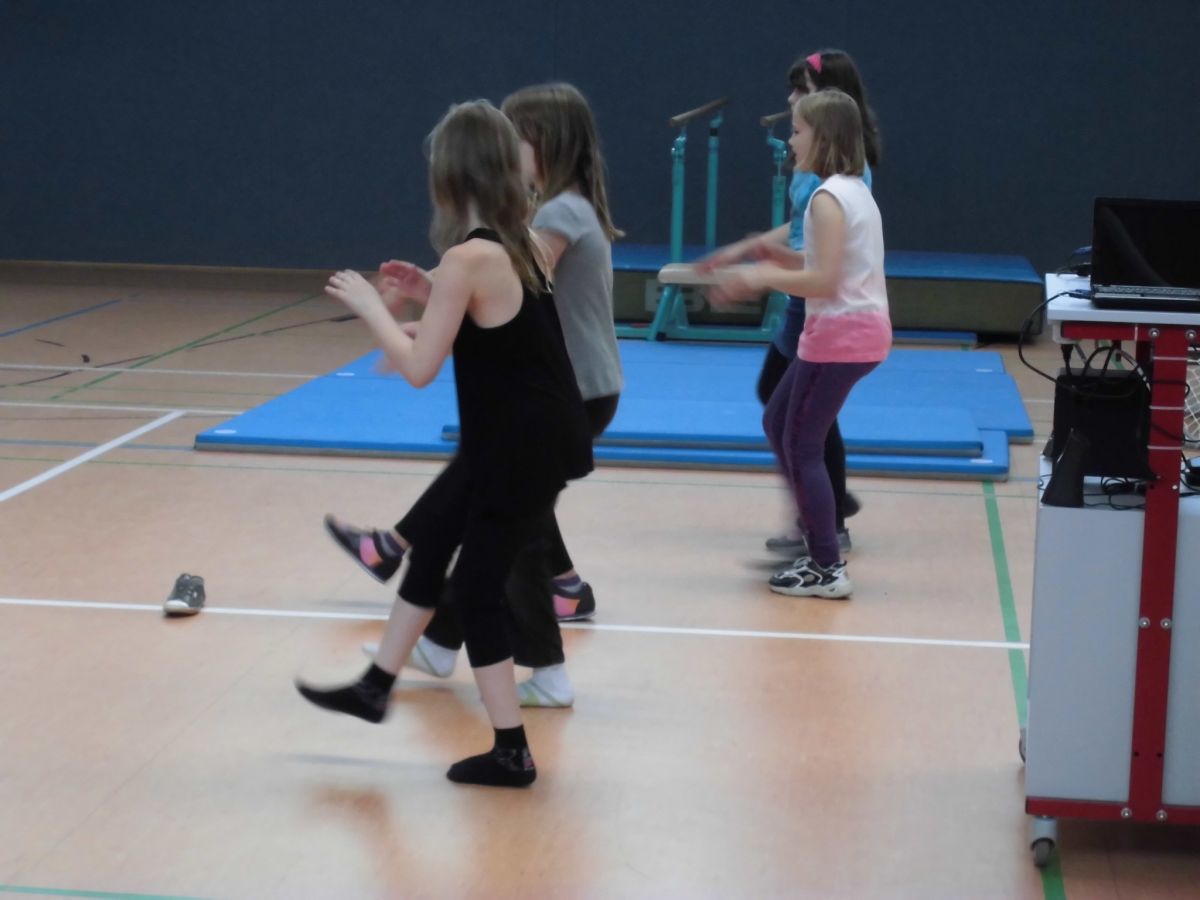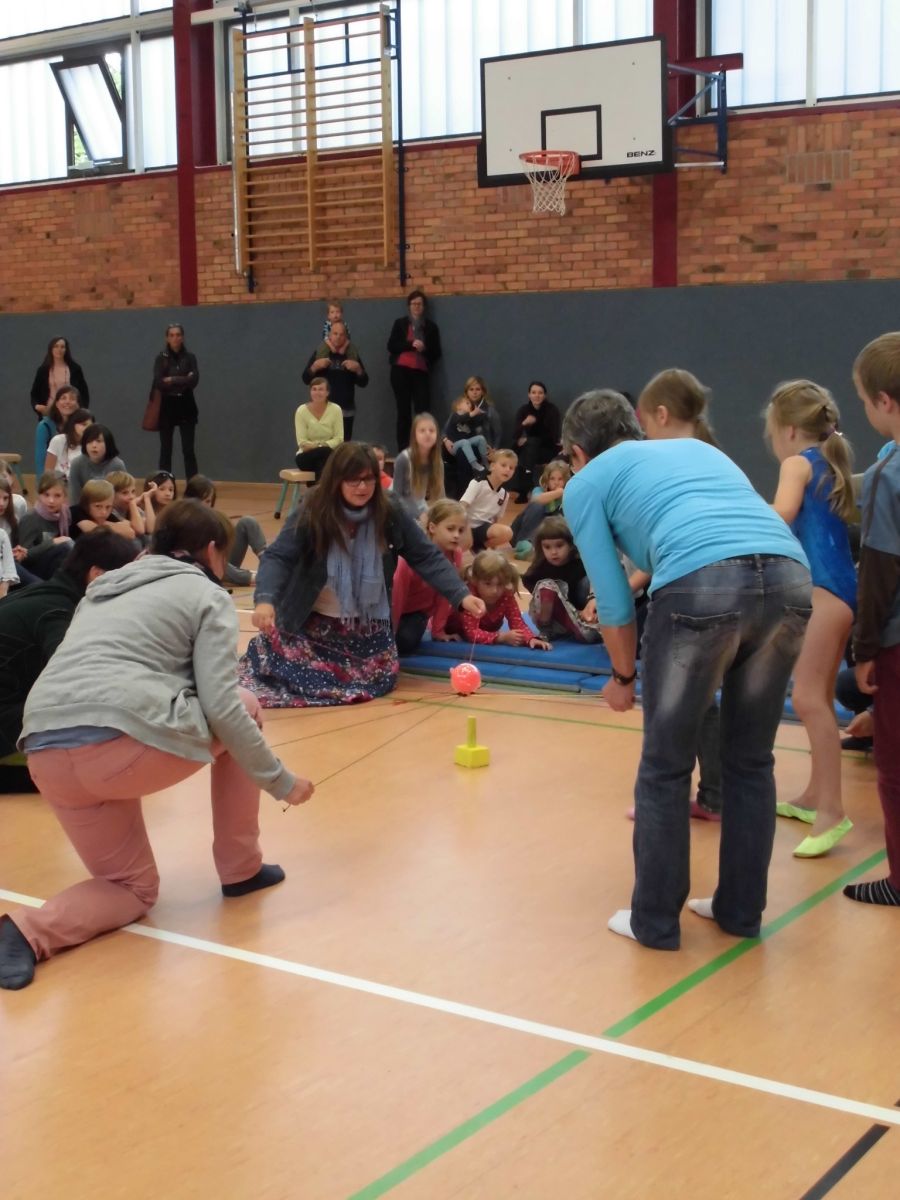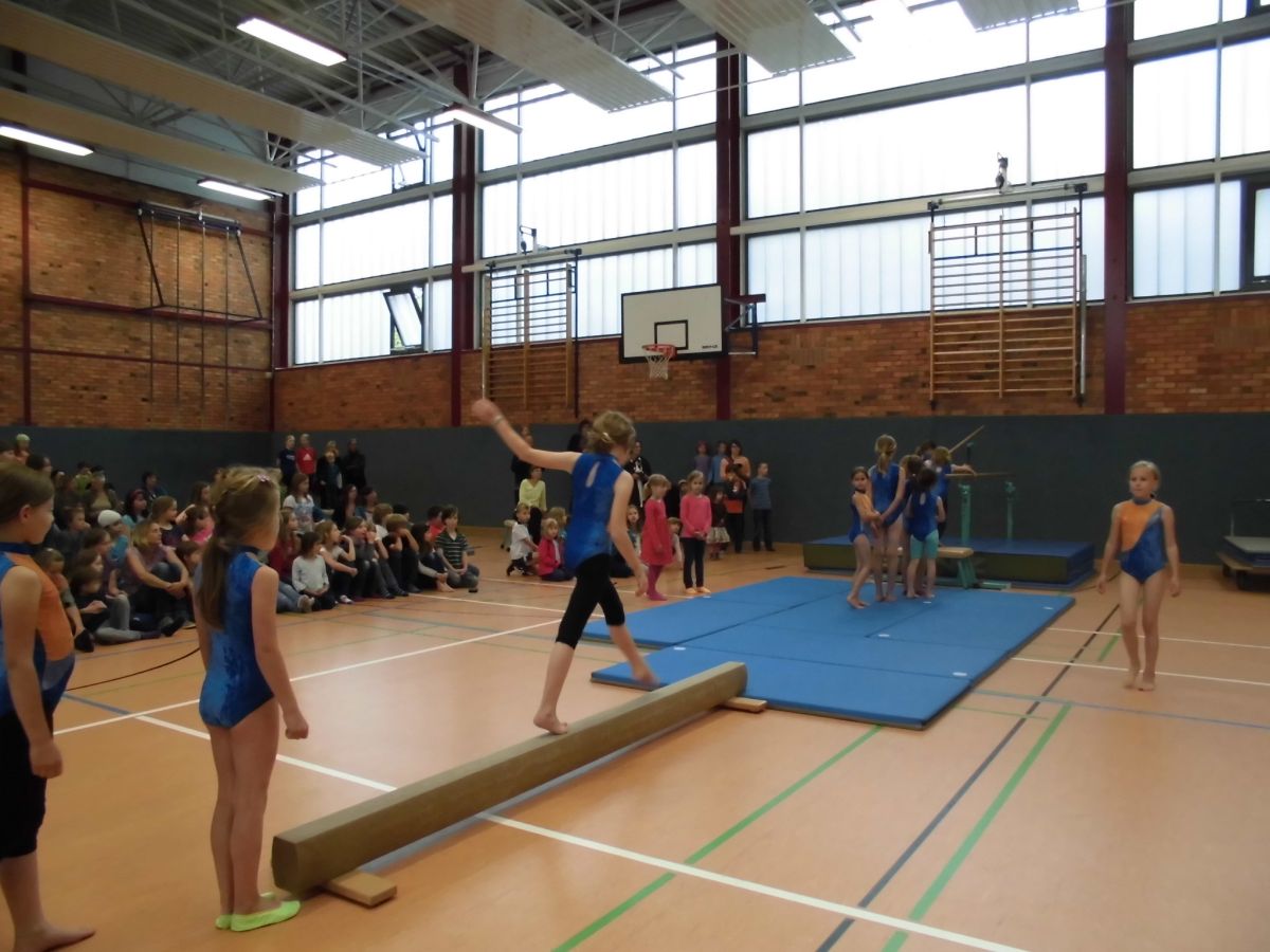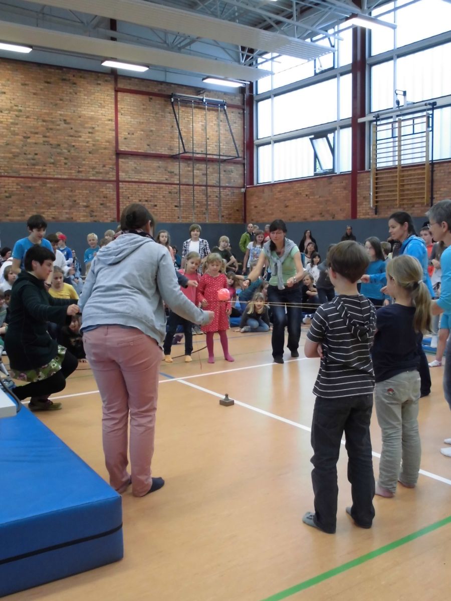 Es folgten die Tänzer, die Fußball-AG, Selbstverteidigung, KIB (Kinder in Bewegung), Kinesologie mit Claudia M. aus dem Hort. Schließlich zeigten die Turnmädels unter Inka aus dem Hort, was sie draufhatten (sogar Salto!), Frau Schuster stellte ihre Judo-Jungs und ihren Sport vor und die letzte AG in der Turnhalle war Rafin (Radio, Film, Internet).