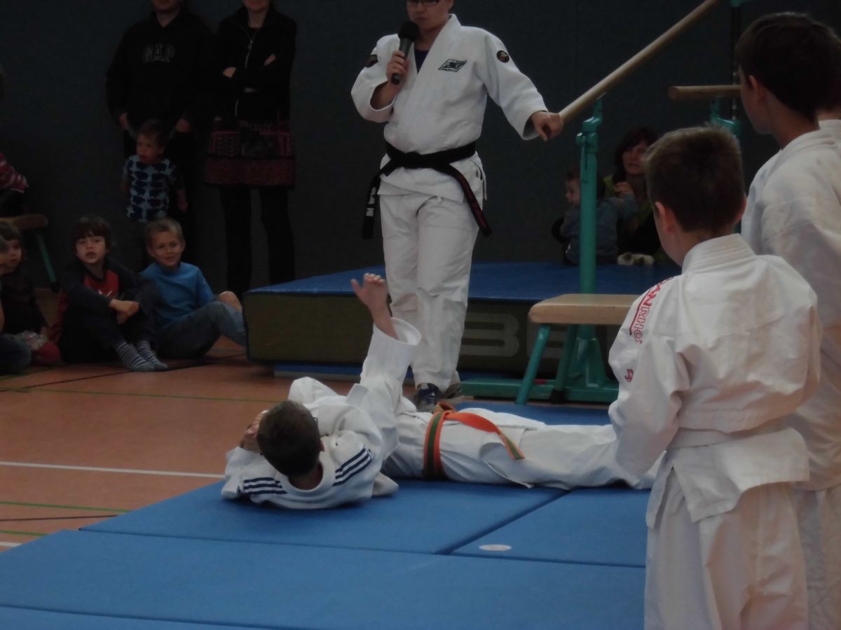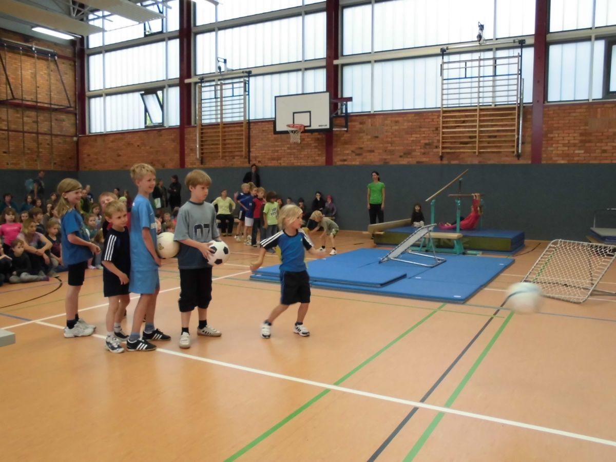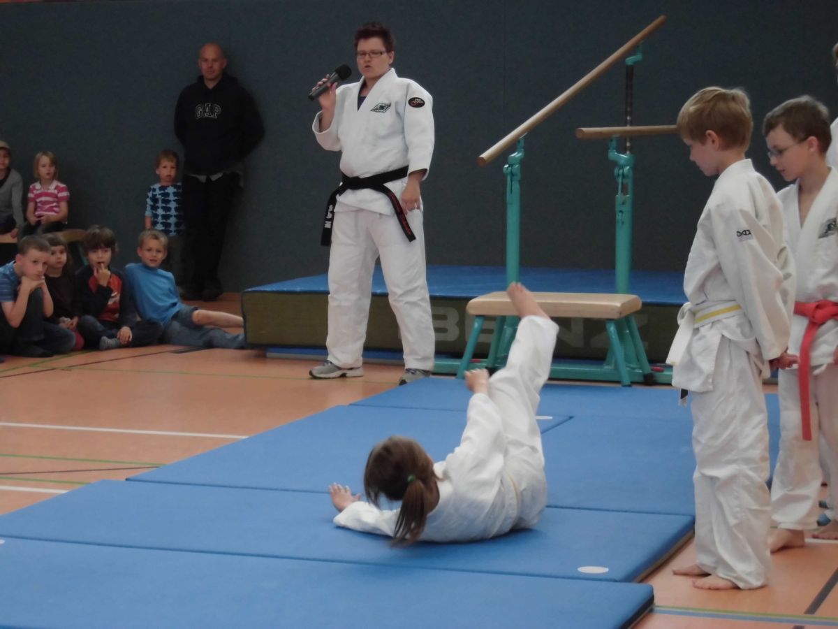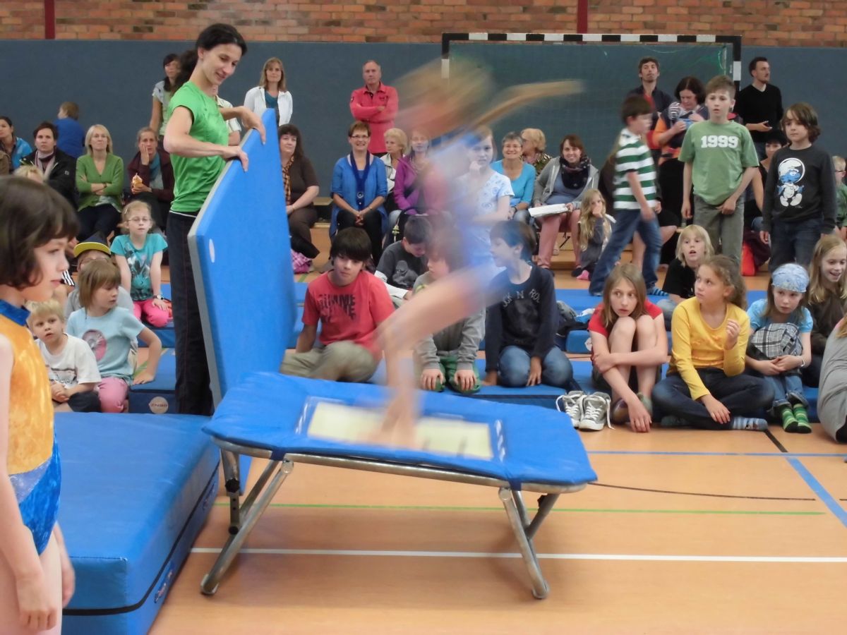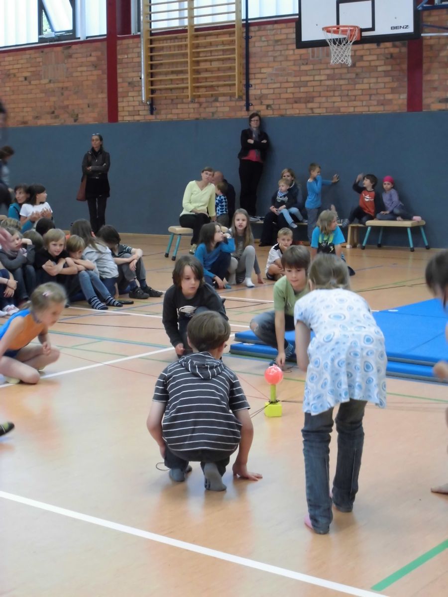 Es folgten die Tänzer, die Fußball-AG, Selbstverteidigung, KIB (Kinder in Bewegung), Kinesologie mit Claudia M. aus dem Hort. Schließlich zeigten die Turnmädels unter Inka aus dem Hort, was sie draufhatten (sogar Salto!), Frau Schuster stellte ihre Judo-Jungs und ihren Sport vor und die letzte AG in der Turnhalle war Rafin (Radio, Film, Internet).