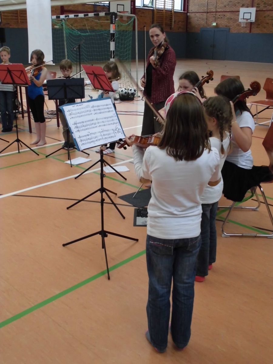 Den Anfang machte das Orchester unter Frau Schächer, kleine Geiger, große Geiger und dazwischen auch mittelgroße Flötisten. Danach schloss sich die AG Töpfern an, Claudia P. aus dem Hort erklärte mit den Kindern, was während des Jahres entstanden ist.