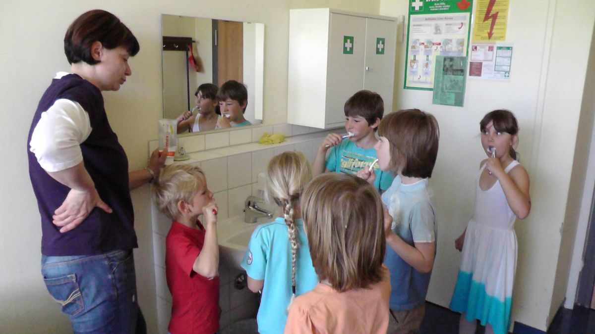 Die kommt jedes Jahr und gern und zeigt den Kindern, wie man richtig Zähne putzt. Außerdem erhalten die Kinder Fluroid, deren Eltern das möchten und anschließend wird (um die Wette) geputzt: