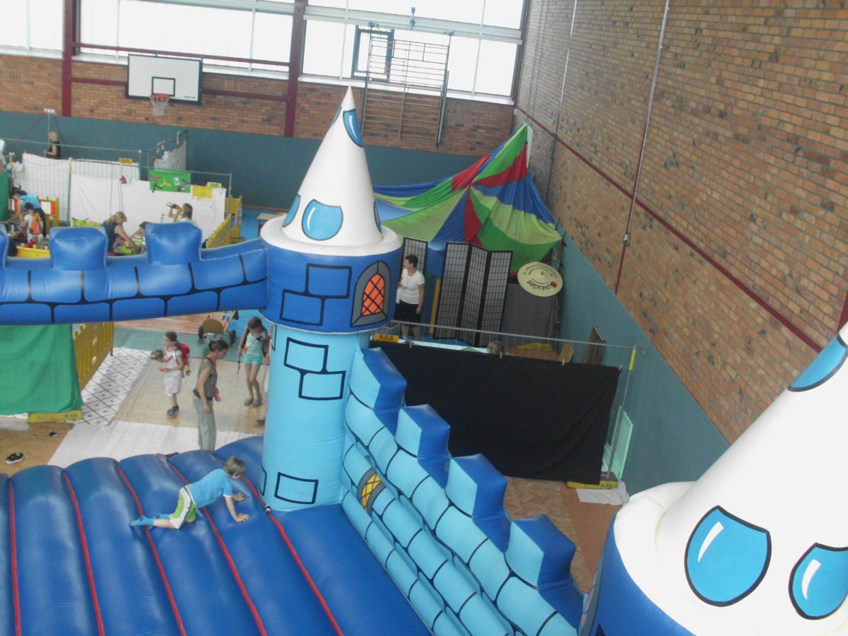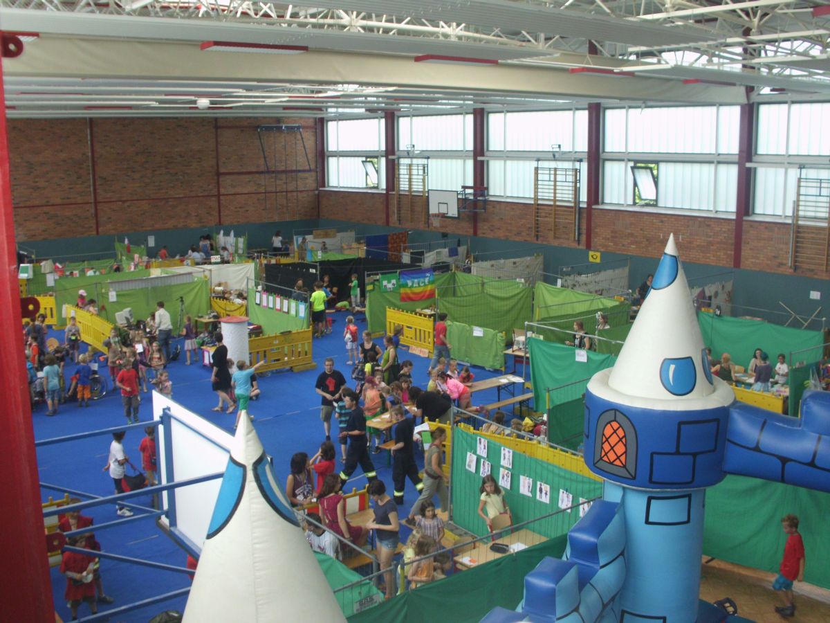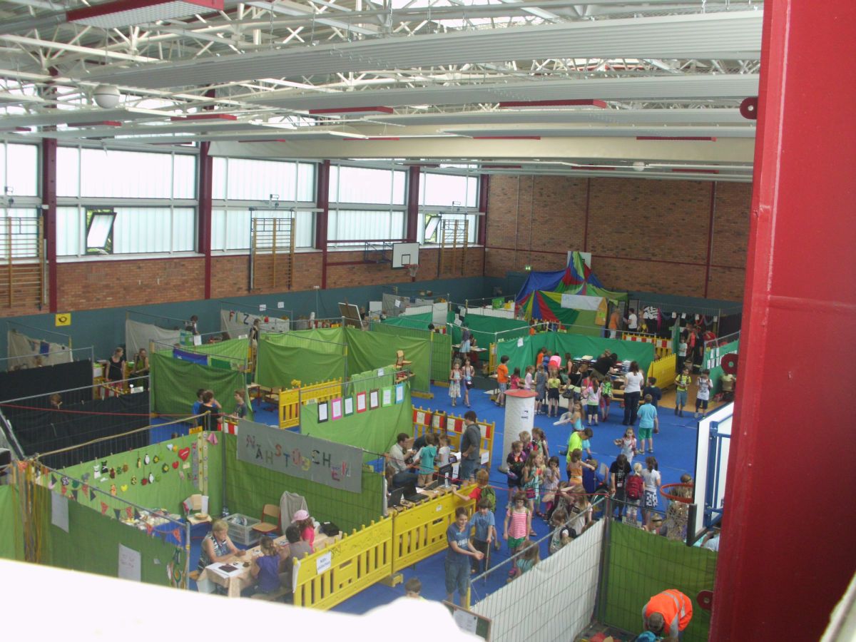 200 Kinder, eine Turnhalle, 20 Berufsstellen, Arbeitsamt, Bank, Behörden, Geldverkehr, Gäste, Helfer, Lehrer, Erzieher, Eltern, 5 Stunden.