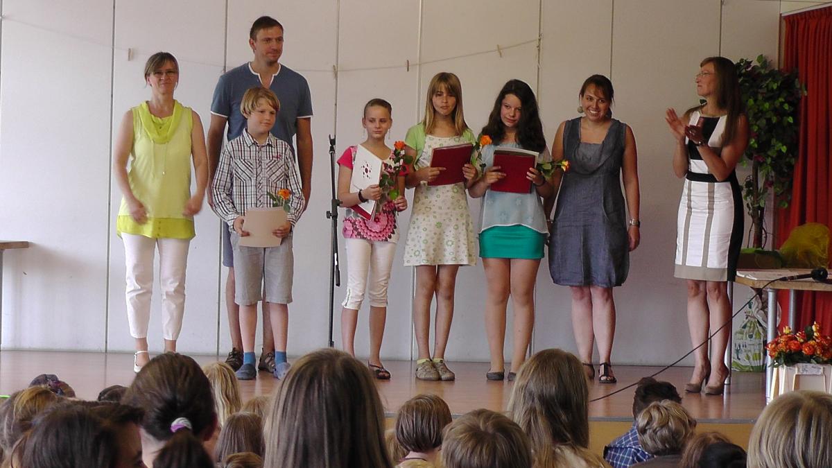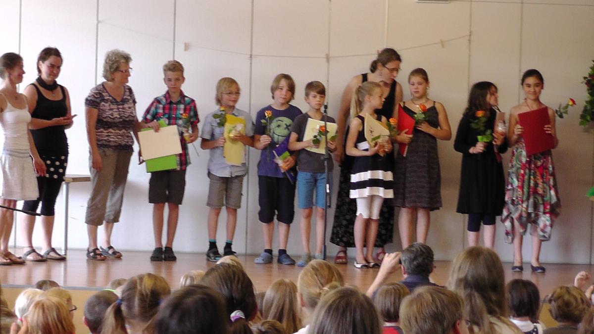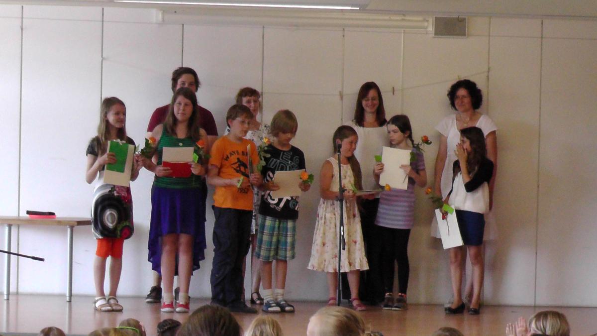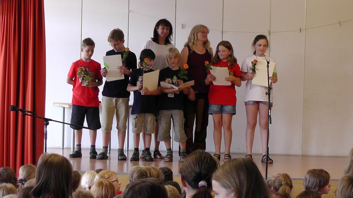 ...wünscht man sich eine Abkühlung! Denn nachdem schon die Erst-, Zweit- und Drittklässler vor der Pause ihre Zeugnisse bekommen hatten, schwitzten die Viertklässler, Eltern und Verwandten, Lehrer, Erzieher und alle Kinder bei der Verabschiedung der Großen.