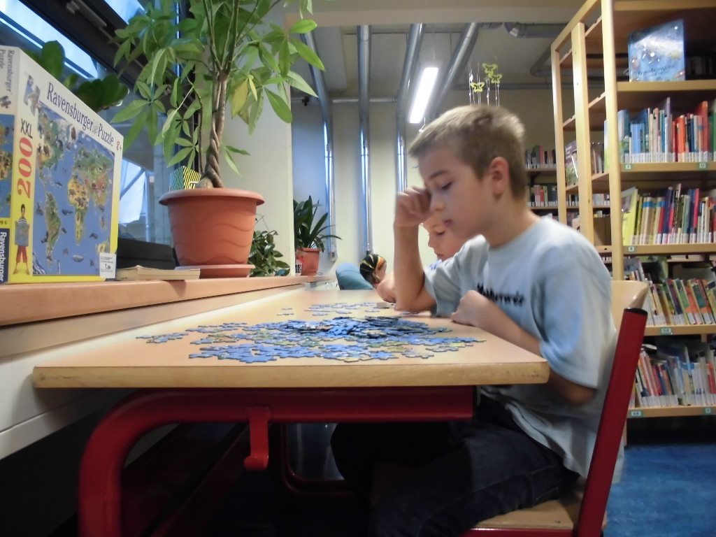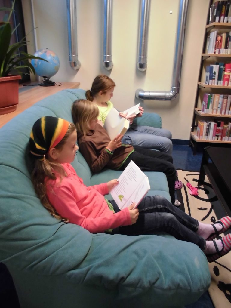 Aber nicht nur Bücher, auch DVDs, Comics und Spiele kann man ausleihen. Wenn man etwas Bestimmtes sucht, z.B für ein Projekt in der Freiarbeit, dann hilft Frau Zechendorf, das Richtige zu finden. Und lesen kann man natürlich auch in der Bibliothek. Eine gemütliche Couch und bequeme Sessel laden dazu ein.