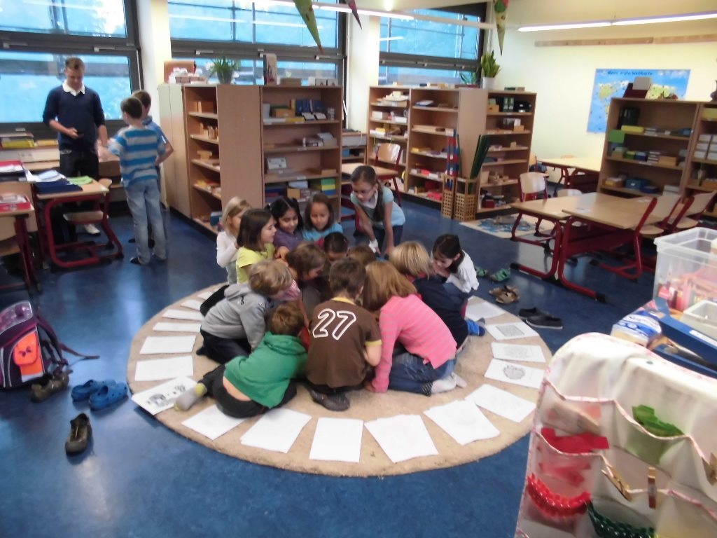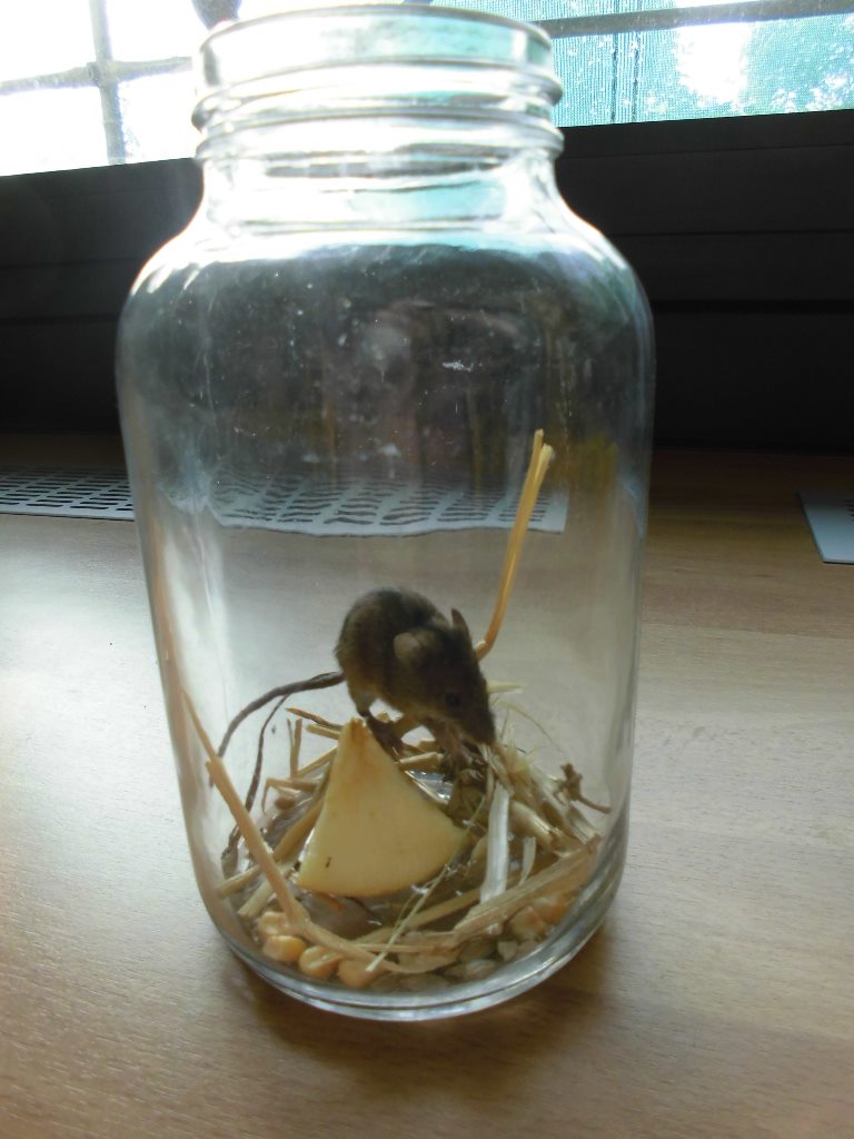 Eine kleine Leckermaus ging auch den Regenbögen ins Netz: in einer Tüte mit Mais zur Dekoration hatte sich eine echte Maus versteckt. In einem Terrarium "gefangen", wurde sie von allen prompt bestaunt. Schließlich wurde der Gast (er bekam den Namen "Frederick") nach der Pause im Schönauer Park in die Freiheit entlassen. Die Kinder bauten dort noch ein Mandala mit Naturmaterial (!) und genossen noch ein wenig die schöne Herbstsonne.