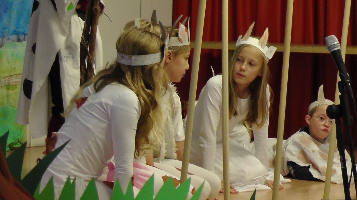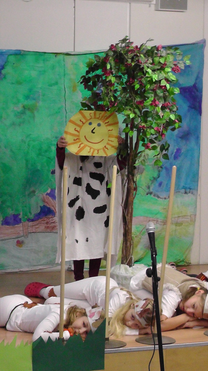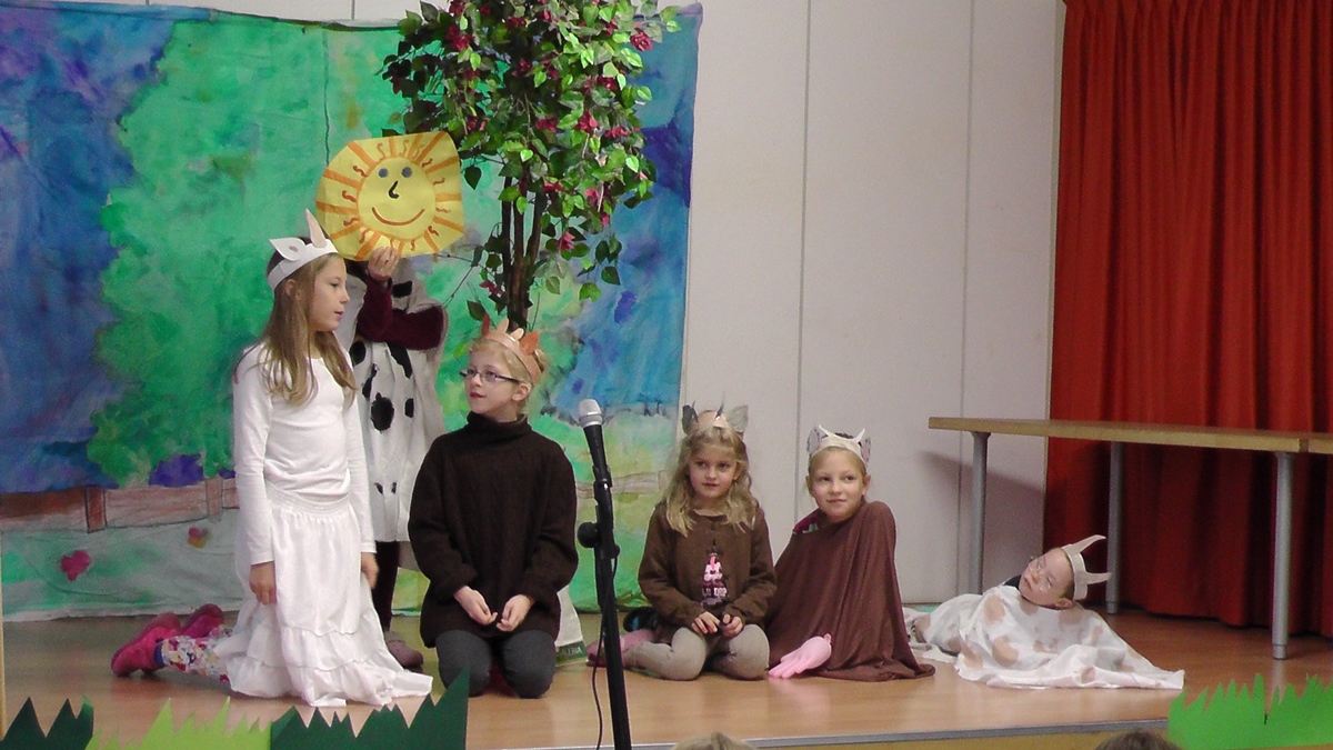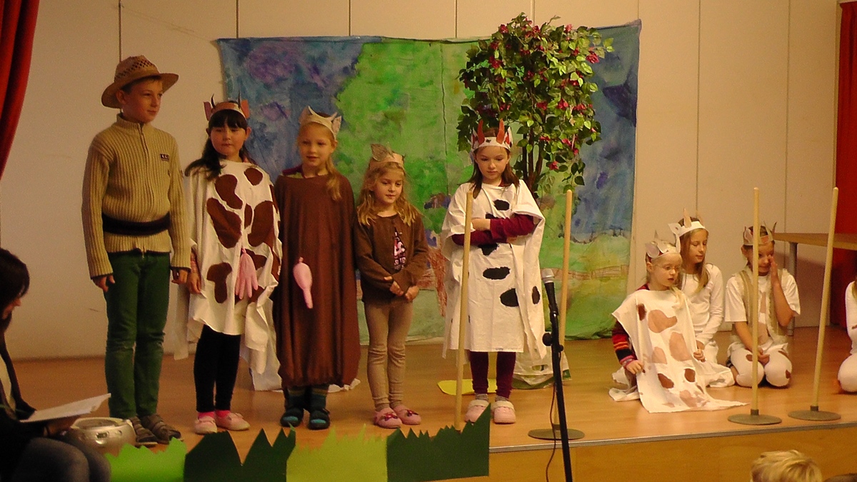 Die Kätzchen-Klasse (ja, nicht die Kuh-Klasse!), bereicherte den Morgenkreis mit einem in der Projektzeit vor den Ferien einstudierten Theaterstück: "Thelma - die weiße Kuh".