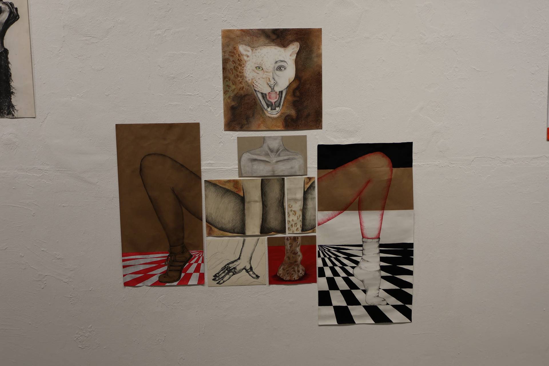 Die Aufgabe ein Selbstporträt zu gestalten hatten sie mit der Auswahl eines Tieres kombiniert. So entstanden Mischwesen, die in ihrer wahren Gestalt erst durch das Zusammenfügen von Einzelformaten erkennbar wurden.