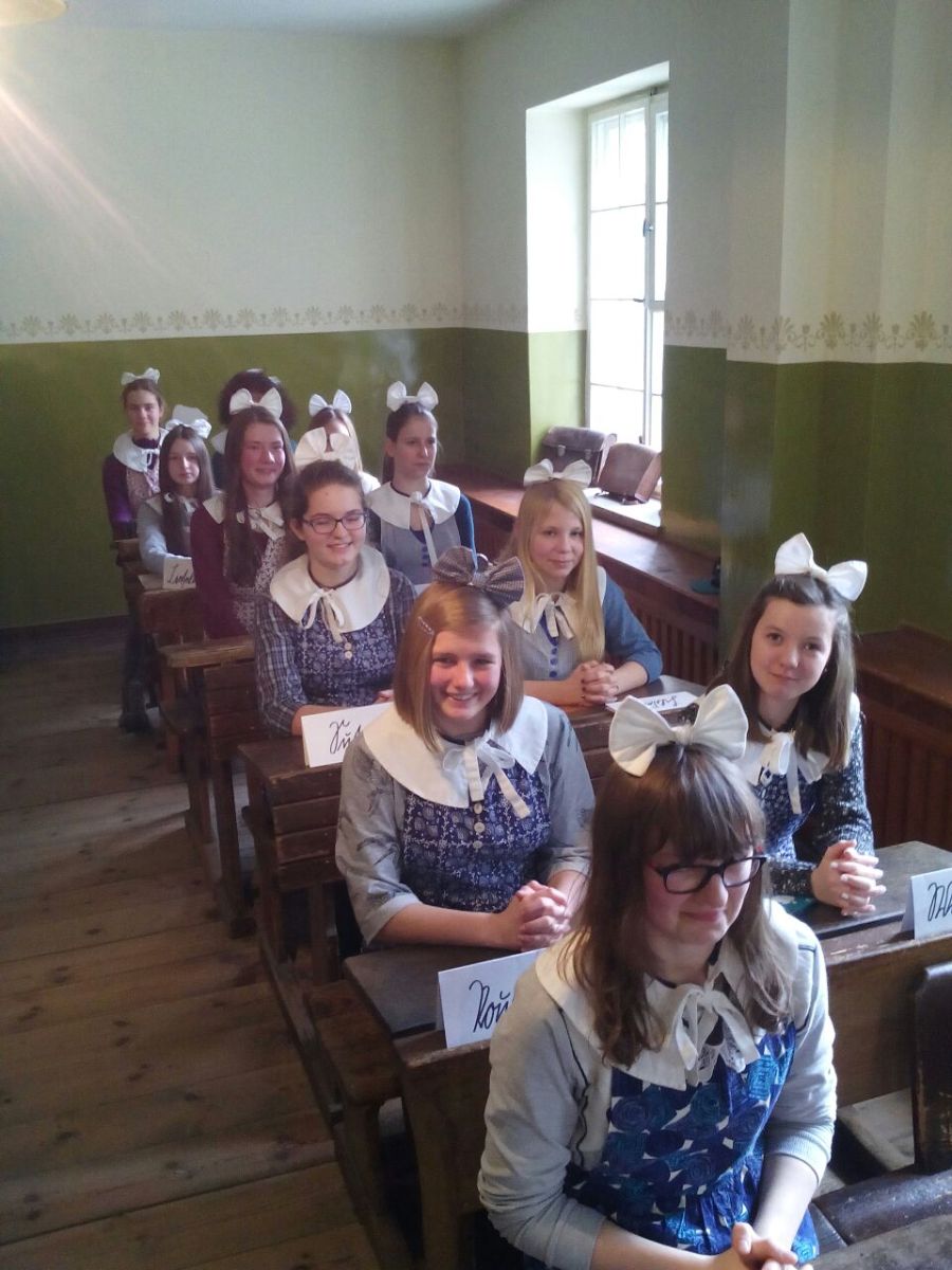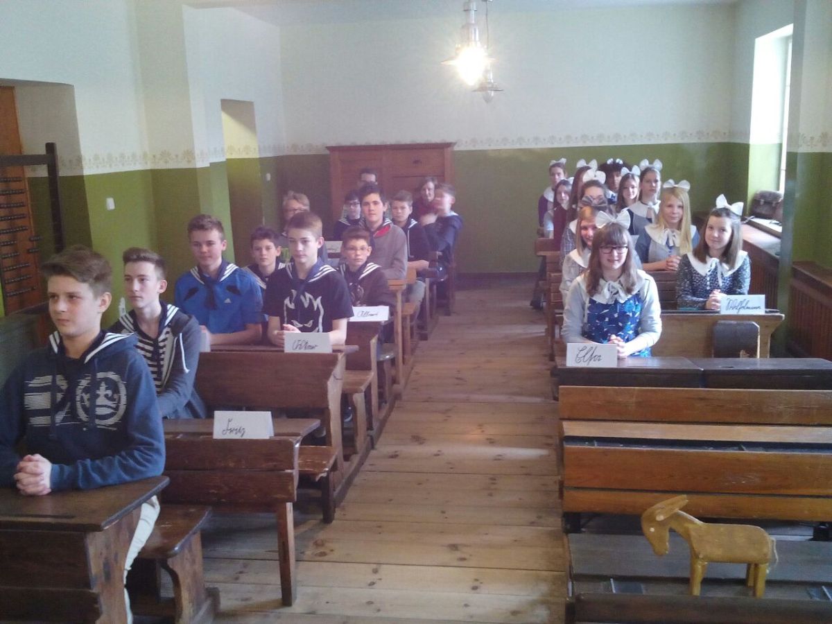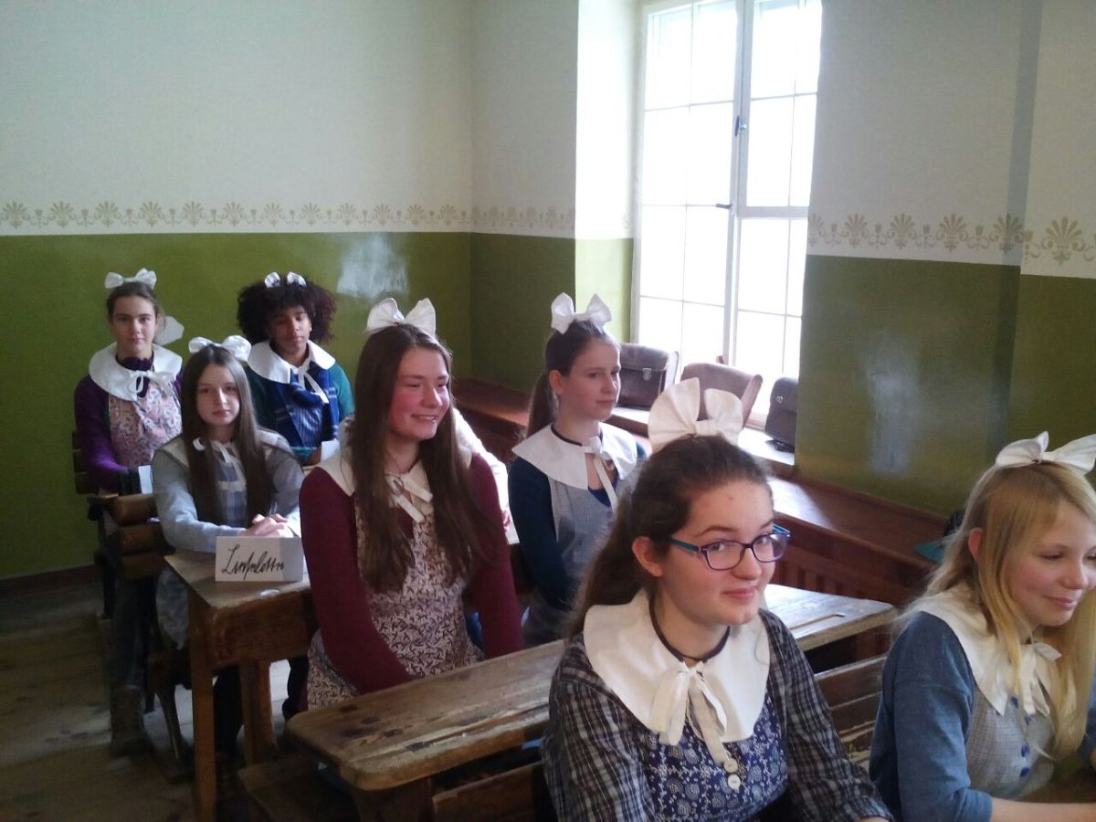 Nachdem in der Woche zuvor einige theoretische Grundlagen erarbeitet und Problemfragen erörtert wurden, konnten die Mädchen und Jungen gemeinsam mit dem Fachlehrer Herrn Hofmann und dem Referendar Christoph Drysz selbst aktiv werden. Unter der eindrucksvollen Leitung von Frau Gerda Haupt erlebten die SchülerInnen samt pädagogischem Personal im Schulmuseum aktiv eine Schulstunde, wie sie im Deutschen Kaiserreich um 1900 stattgefunden haben könnte.