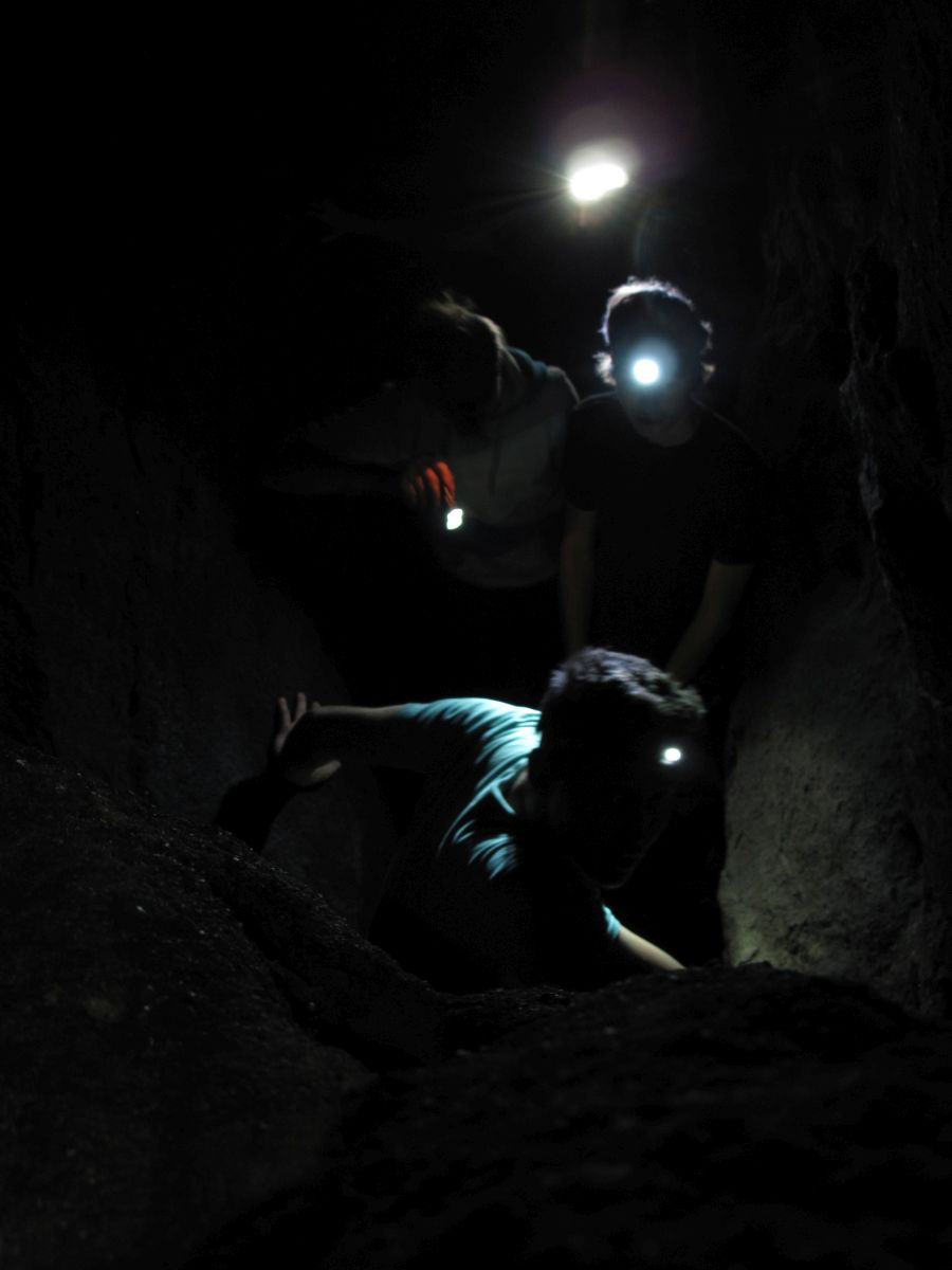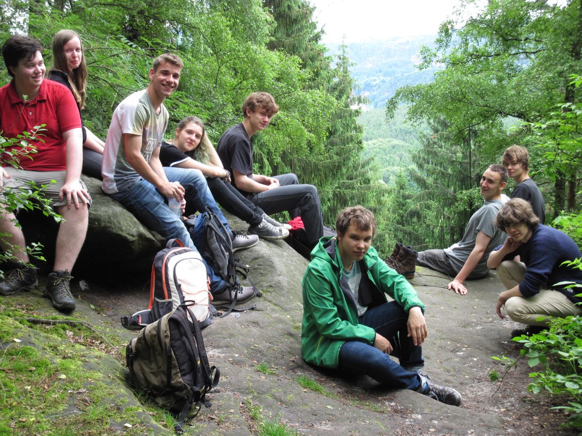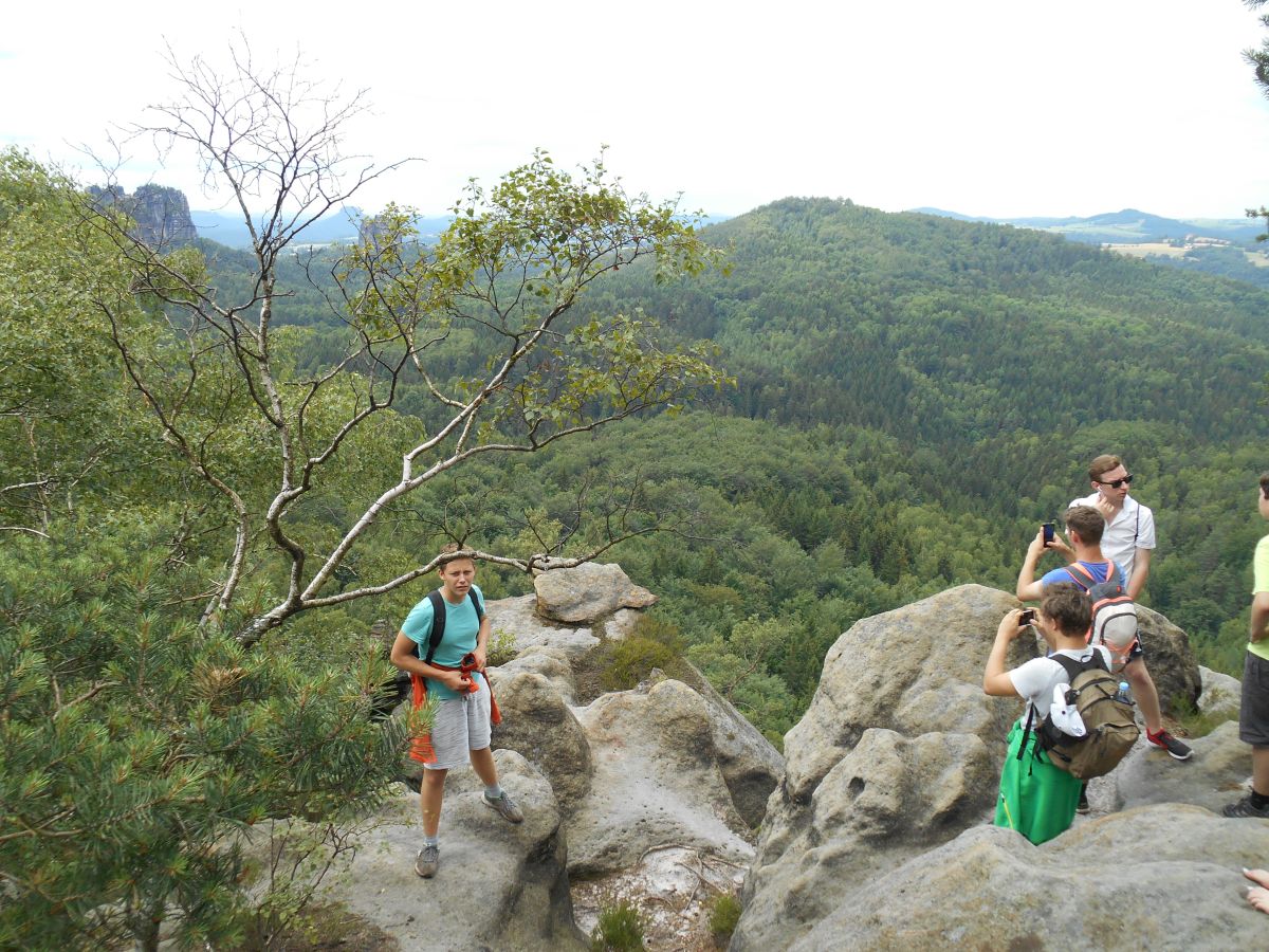 Wenig Schlaf und ein hastiges aber reichhaltiges Frühstück waren Vorbereitung genug, um die für den finalen Tag geplante, gemeinschaftliche Wanderung anzutreten, das Ziel: Eine versteckte Höhle (die Sandlochhöhle) in den Höhen des Elbsandsteingebirges. Nach dem mühsamen von Stufen gesäumten Anstieg auf ca. 450 m Höhe am Zielfelsen angekommen, ergab sich die Gelegenheit einer abenteuerlichen Höhlenerkundung unter professioneller Anleitung von Herrn Otto.