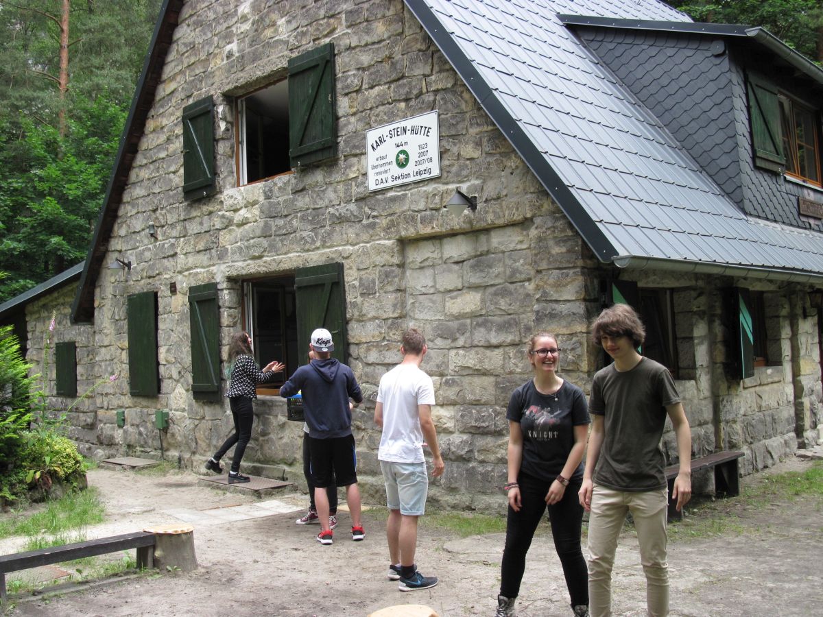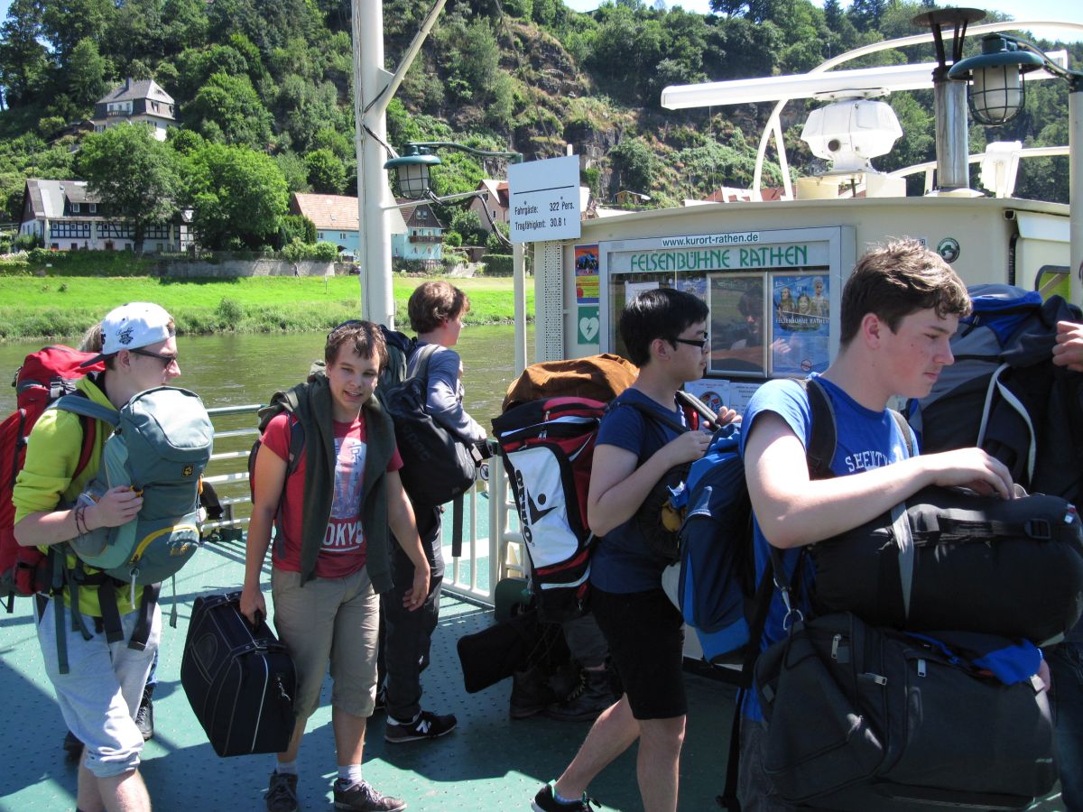 Vom Rathener Bahnhof ging es dann zur Fähre, mit welcher wir die Elbe überqueren mussten. Auf der anderen Seite stand dann noch ein ca. zwanzigminütiger Fußmarsch mit abschließender „Gipfelbesteigung“ zur Hütte an. Diese erreichten wir auch alle, lediglich von der Last der Rucksäcke etwas geschafft.