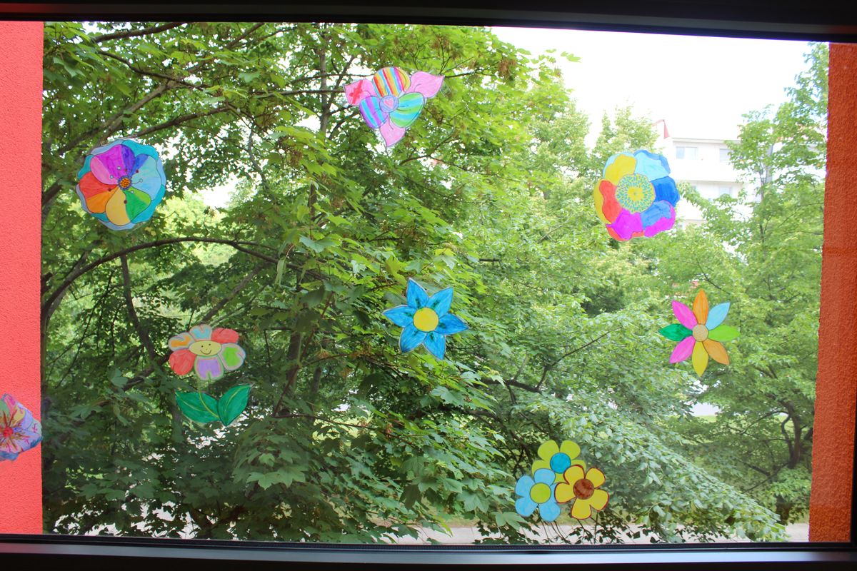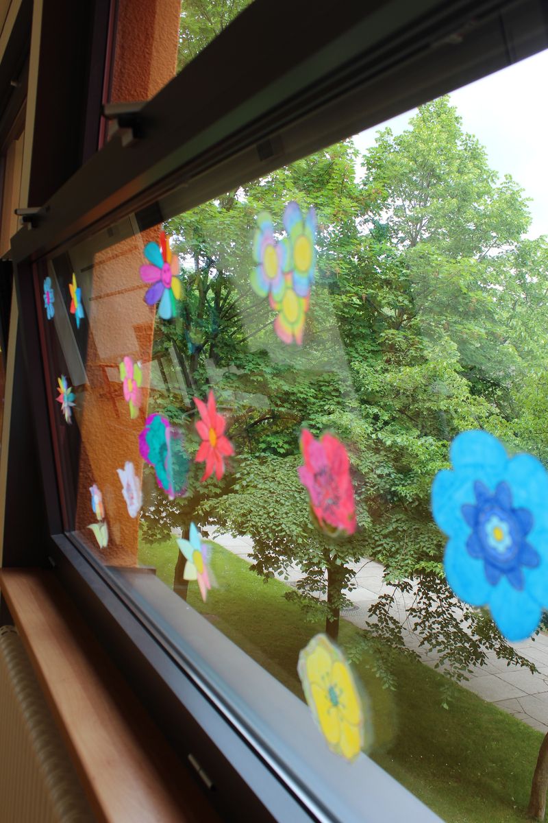 Auf den Fluren der Grundschule kann man an den Fenstern die Blumen der Kinder entdecken. Das österliche Überraschungpaket beinhaltete zwar auch richtige Samen, aber deren Wachstum braucht noch etwas Zeit, damit man sie vorzeigen kann.