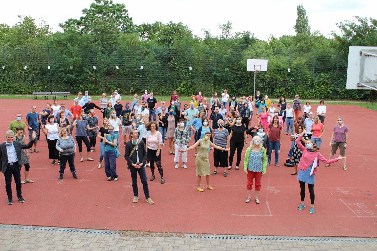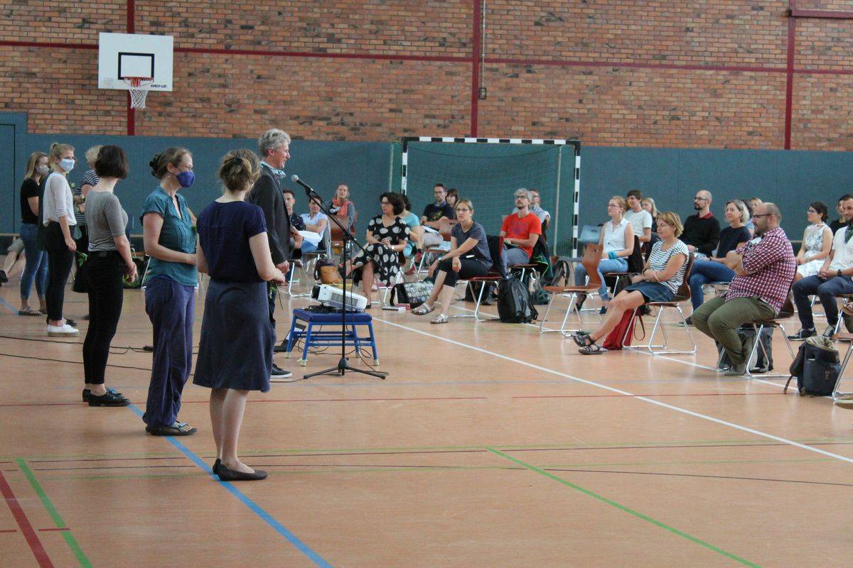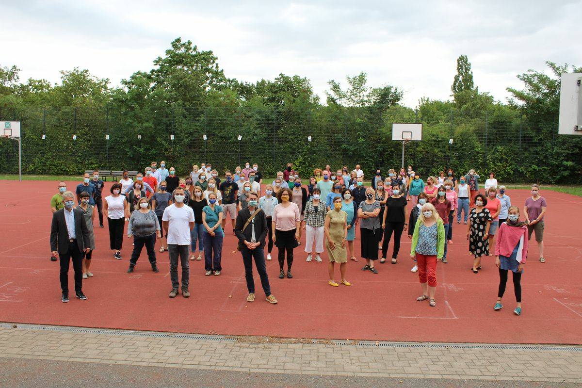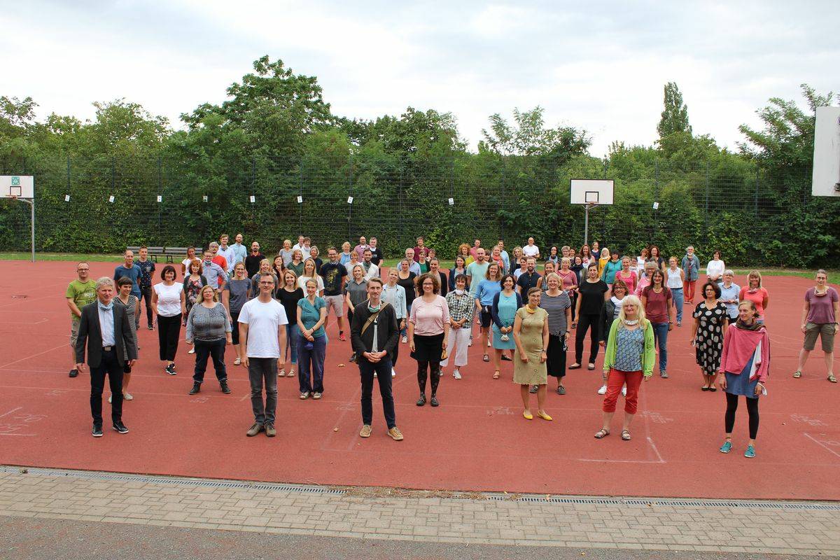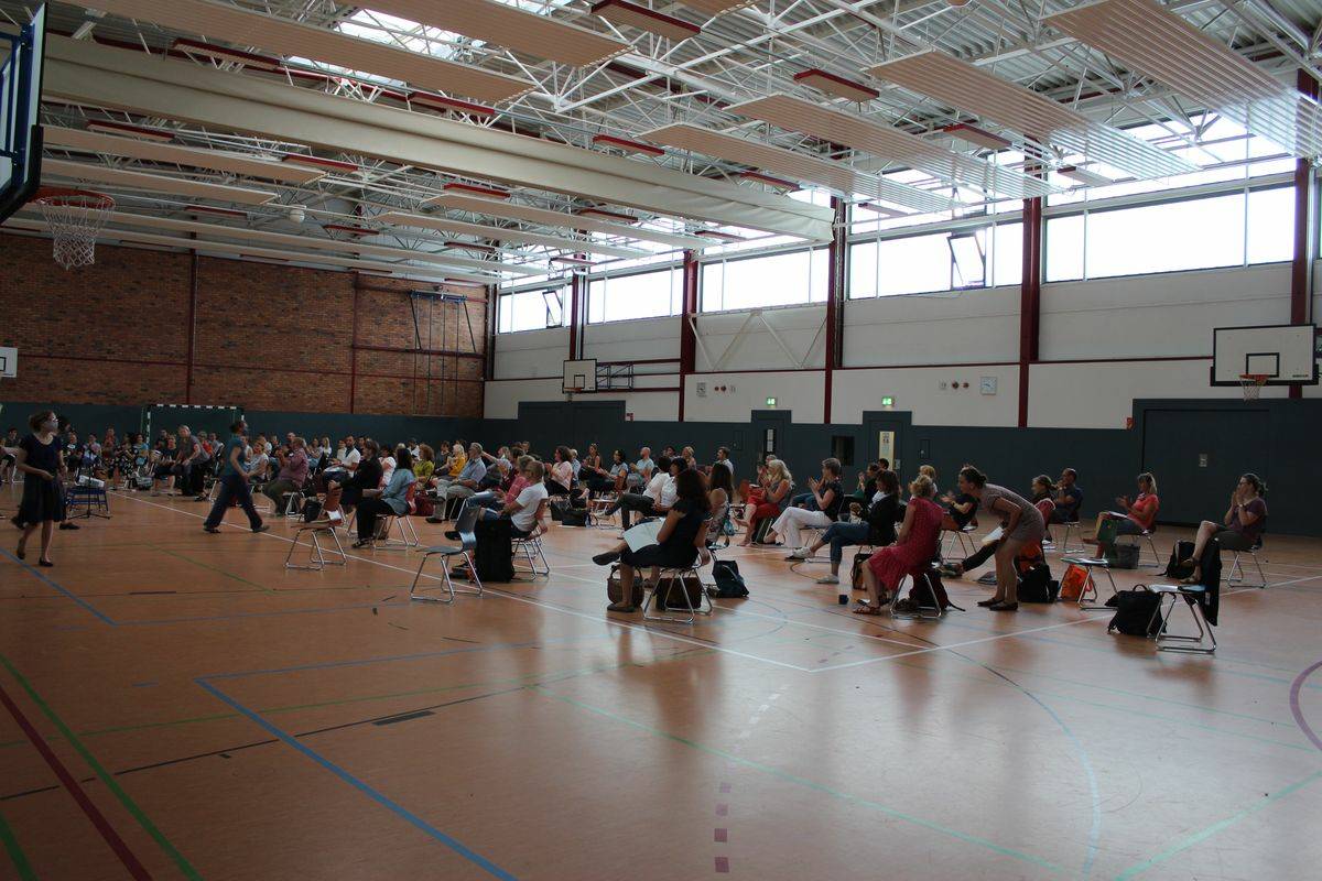 Unter besonderen Bedingungen trafen sich heute die Kollegien der verschiedenen Schulteile des Schulzentrums zuerst in der Turnhalle und dann auf dem Sportplatz.