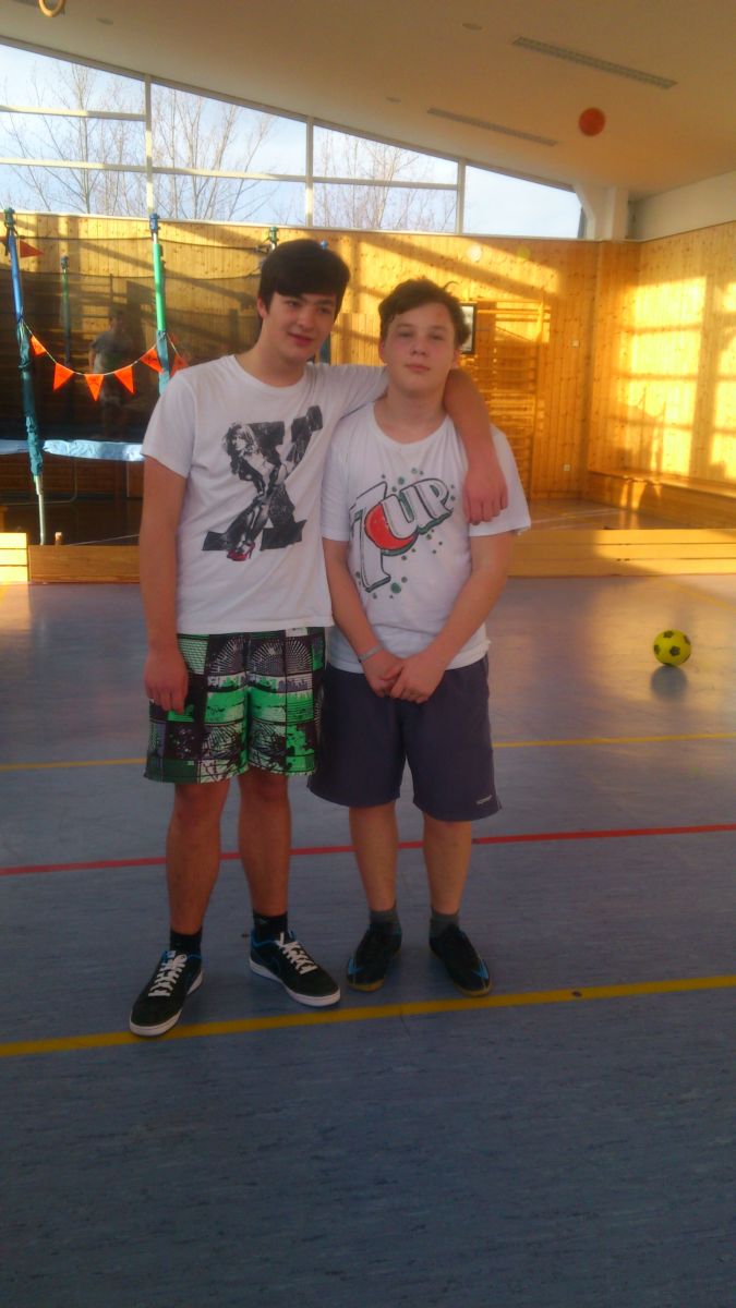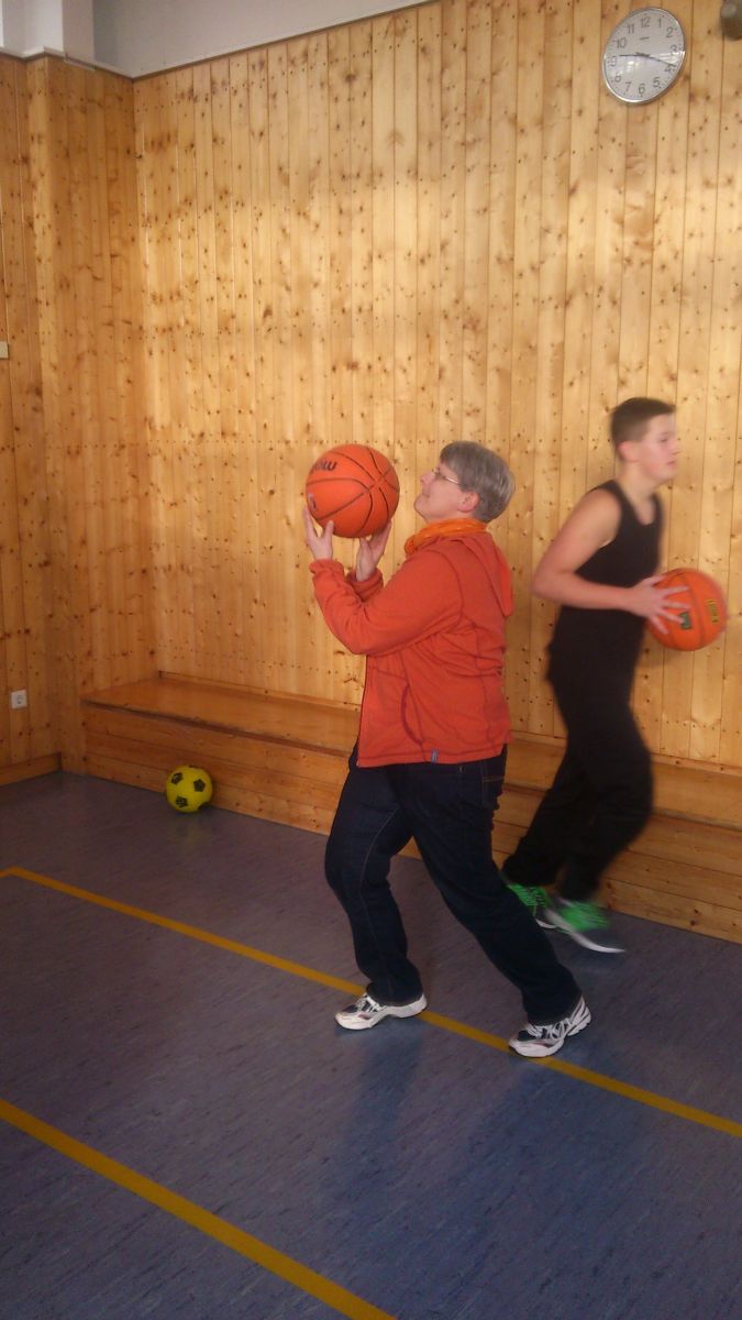 Das Projekt „Sport, Spiele, Spaß“ findet in der Turnhalle der Förderschule statt im Rosenweg statt. Geleitet wird das Projekt von Oliver und Alexander aus der 9b. Die Betreuerin Frau Brier hat heute morgen schon ihren ersten Korb geworfen,