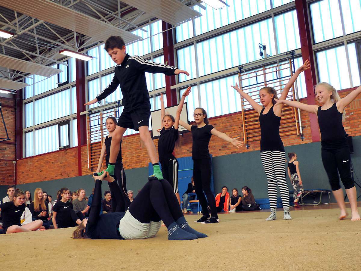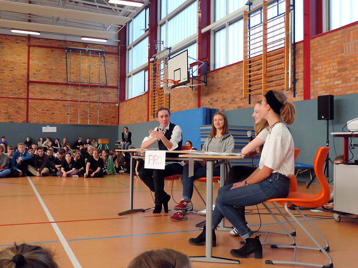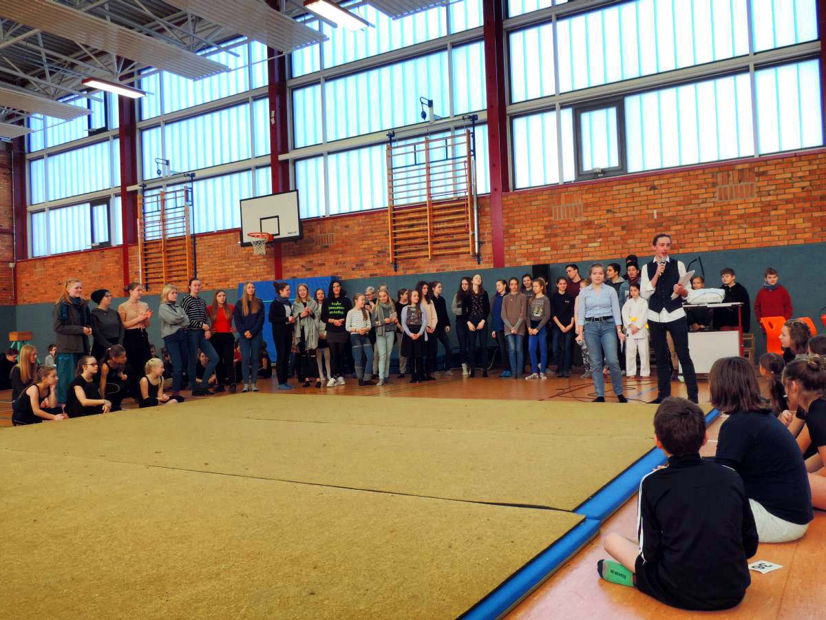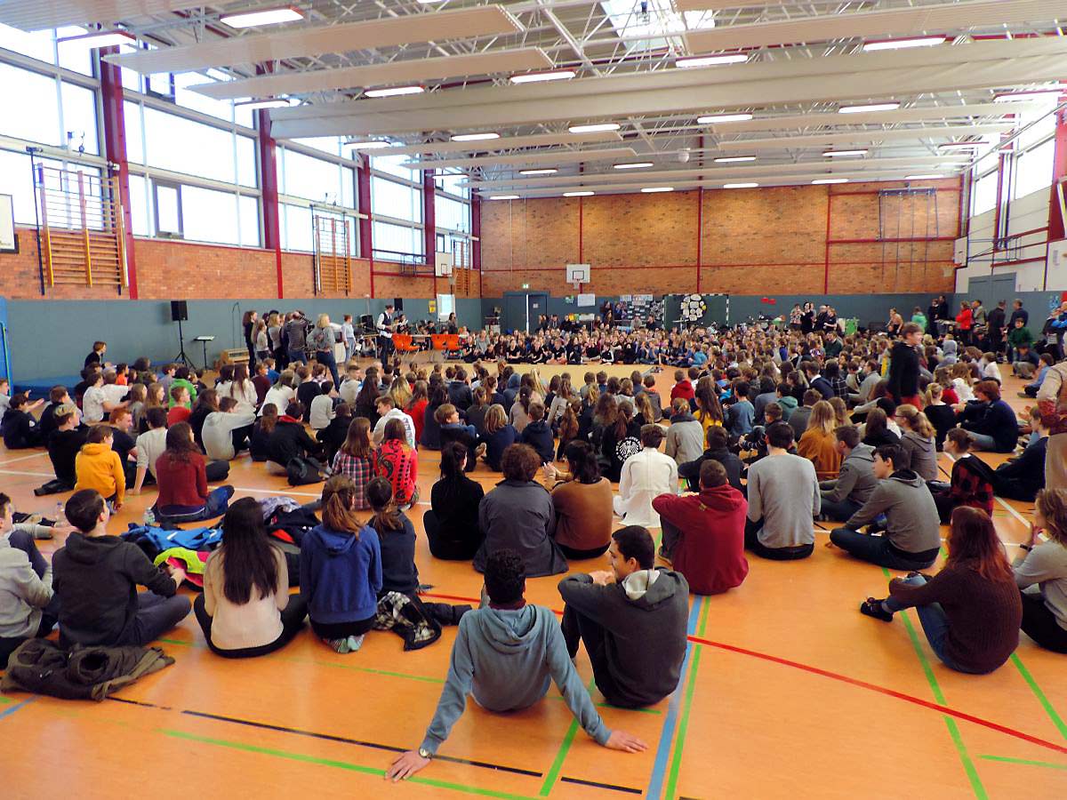 Überzeugend war dabei auch die angenehme, humorvolle und nie langweilige Moderation von Alexander Zettel (9c) und Josefine Kremer (10c). Die beiden führten durch den Bühnen-Teil der Präsentationen, denn wie auch in den Jahren zuvor, präsentierten Gruppen vor allen 650 Schülern der weiterführenden Schulen live und ohne Netz und doppelten Boden ihre Ergebnisse. Und nach dem die Akrobaten geflogen waren, die Streetdancer getanzt, Schulband und die „Sänger ohne Noten“ gesungen und die Debattierer im Debattierclub debattiert haben, war auch noch genügend Zeit für alle, durch die Sporthalle zu gehen, um all die anderen Ergebnisse zu sehen. Denn natürlich kann der Seifenworkshop kein Bühnenprogramm auf die Beine stellen, stellt stattdessen im individuellen Beratungsgespräch lieber die Vorzüge der verschiedenen schaumigen Endprodukte heraus. Und so zeigten andere Projektgruppen während des Rundgangs den Besuchern ihres Stands auch die selbstgebastelten Jute-Mäuse oder die Buchständer für die neuen Lernbüros, die ab kommendem Schuljahr unsere Schule bereichern werden. Über Visionen eines zusätzlichen Schulgebäudes wurde ebenso gesprochen wie über die Kunst aus Schrott oder die Frage „Was ist Kunst?“ Am Ende lobte Schulleiter Sebastian Heider die Ergebnisse und das Engagement der Schüler. „Es ist immer wieder schön, wenn bei uns der 7. Klässer dem 10. Klässer die Welt erklären kann.“