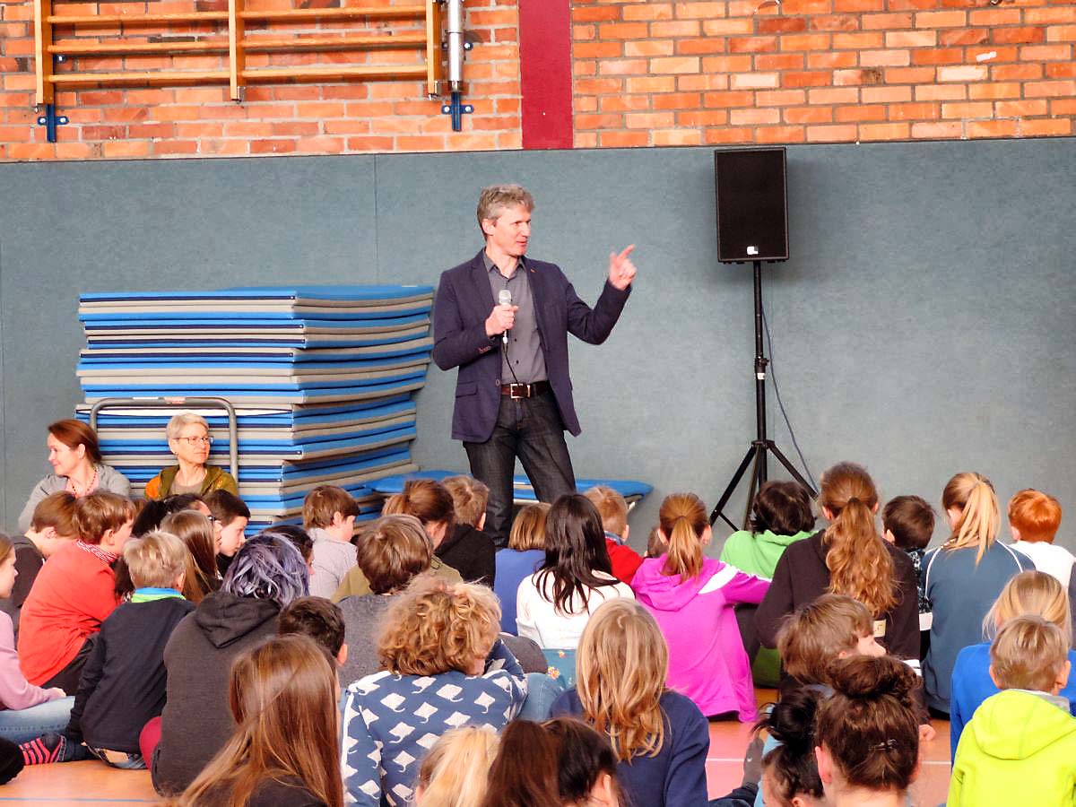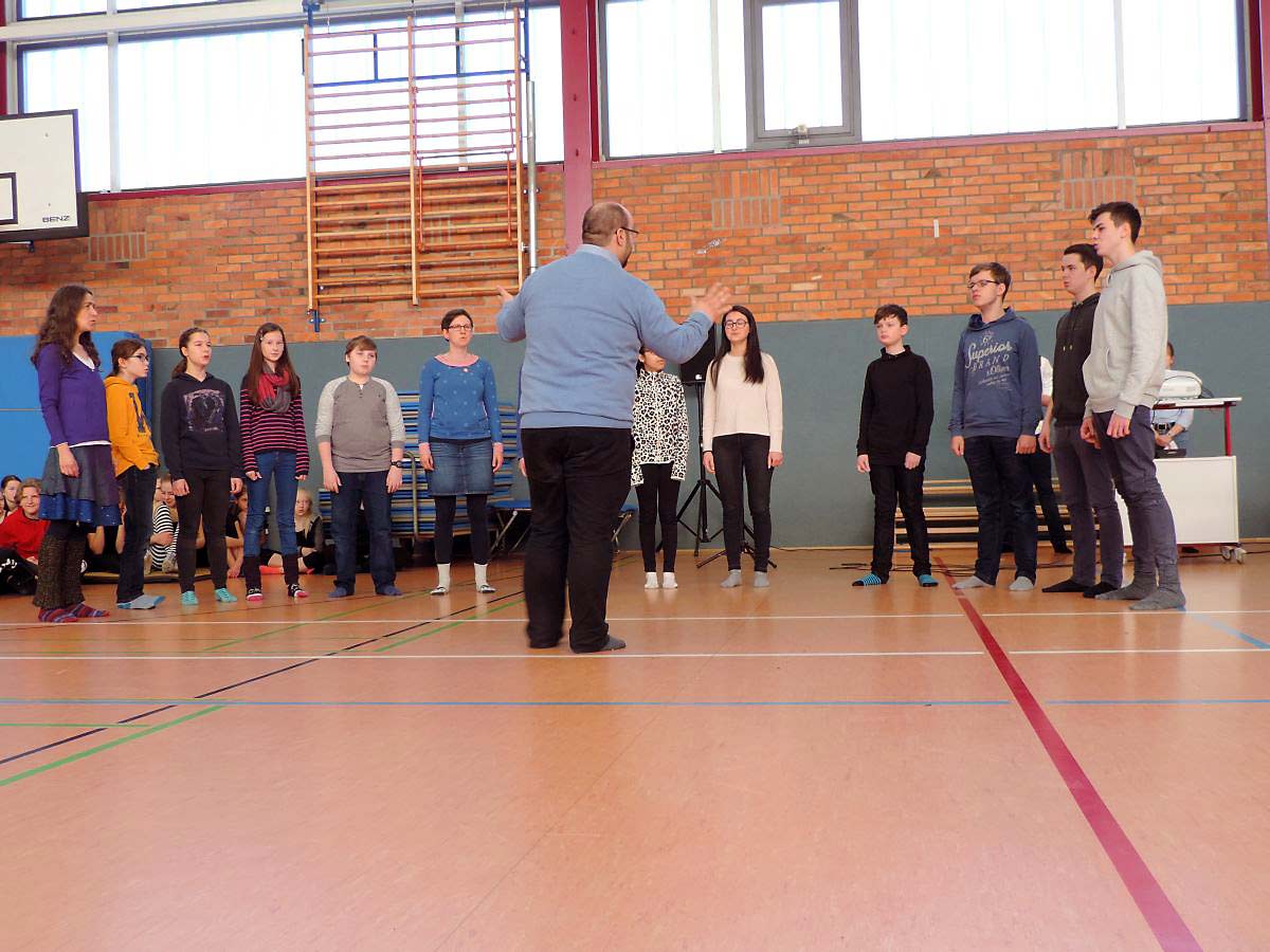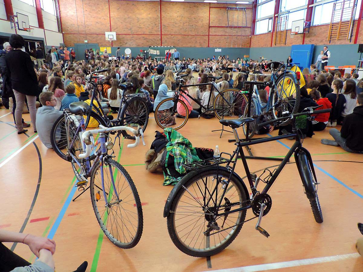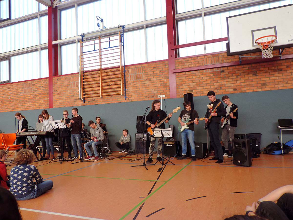 Überzeugend war dabei auch die angenehme, humorvolle und nie langweilige Moderation von Alexander Zettel (9c) und Josefine Kremer (10c). Die beiden führten durch den Bühnen-Teil der Präsentationen, denn wie auch in den Jahren zuvor, präsentierten Gruppen vor allen 650 Schülern der weiterführenden Schulen live und ohne Netz und doppelten Boden ihre Ergebnisse. Und nach dem die Akrobaten geflogen waren, die Streetdancer getanzt, Schulband und die „Sänger ohne Noten“ gesungen und die Debattierer im Debattierclub debattiert haben, war auch noch genügend Zeit für alle, durch die Sporthalle zu gehen, um all die anderen Ergebnisse zu sehen. Denn natürlich kann der Seifenworkshop kein Bühnenprogramm auf die Beine stellen, stellt stattdessen im individuellen Beratungsgespräch lieber die Vorzüge der verschiedenen schaumigen Endprodukte heraus. Und so zeigten andere Projektgruppen während des Rundgangs den Besuchern ihres Stands auch die selbstgebastelten Jute-Mäuse oder die Buchständer für die neuen Lernbüros, die ab kommendem Schuljahr unsere Schule bereichern werden. Über Visionen eines zusätzlichen Schulgebäudes wurde ebenso gesprochen wie über die Kunst aus Schrott oder die Frage „Was ist Kunst?“ Am Ende lobte Schulleiter Sebastian Heider die Ergebnisse und das Engagement der Schüler. „Es ist immer wieder schön, wenn bei uns der 7. Klässer dem 10. Klässer die Welt erklären kann.“