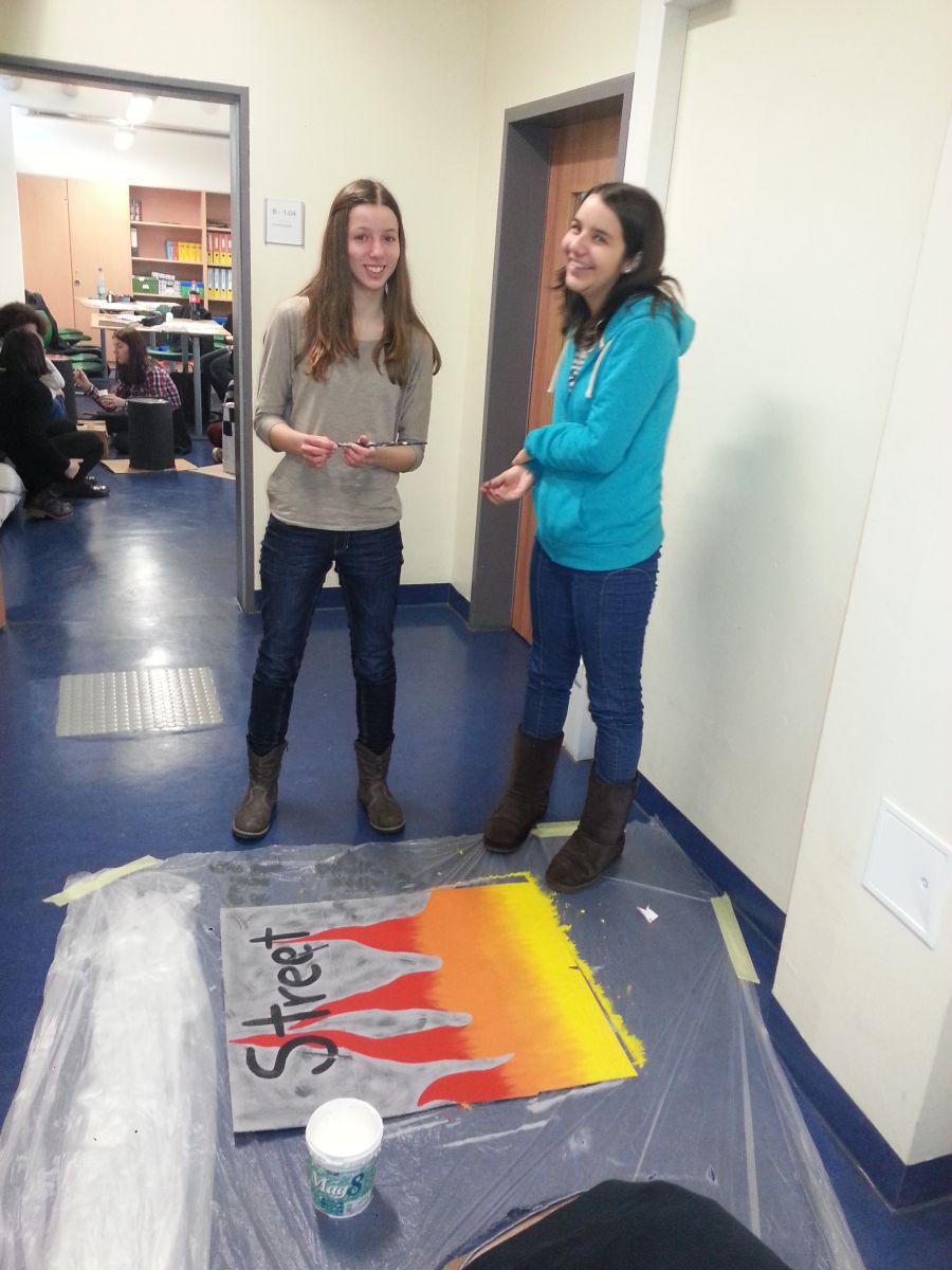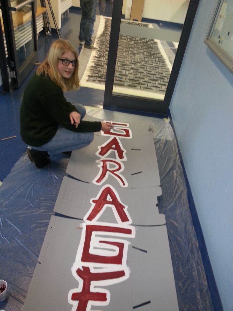 Die Jugendlichen bringen Spaß, Geschick und Kreative Ideen auf Pappe und Stoff die Später den Hintergrund im Musical darstellt. Heute werden die letzten Pinsel in Farbe getaucht und die letzten Striche werden gezogen. Dann geht es ins Haus Auensee, um dort das Bühnenbild vorzubereiten.