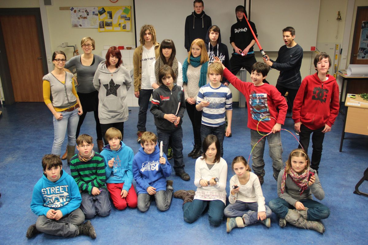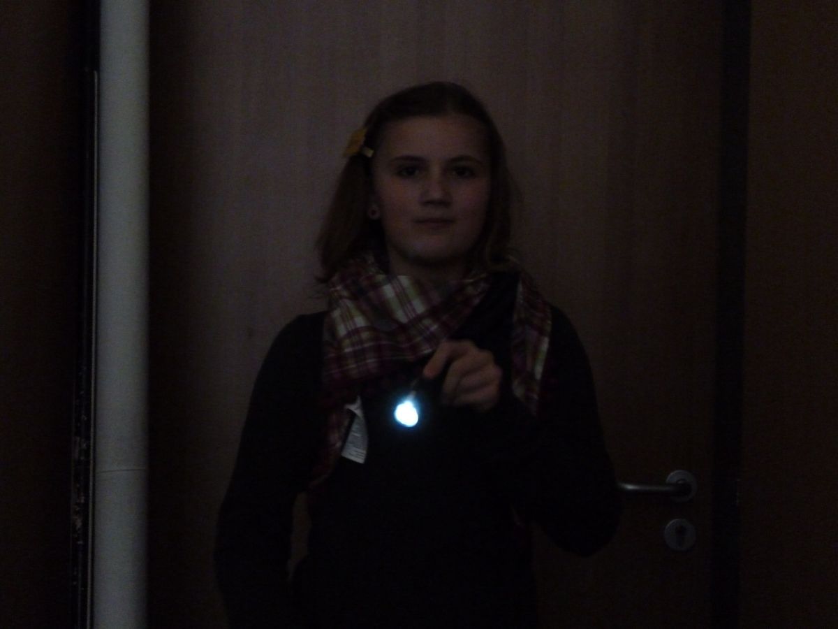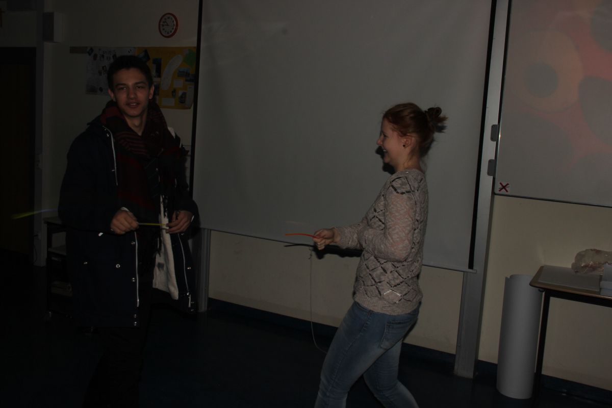 Neun Uhr am Morgen, es wird dunkel im Raum A 3.13. Man sieht die Hand vor Augen nicht. Plötzlich ein weißer Lichtstrahl, es folgen rote, grüne und blaue Lichtfetzen; hin und wieder ein kurzer Blitz, der den Raum für eine Sekunde erhellt; ständig das Klicken der Fotokameras und das kreative Getuschel der Schüler.