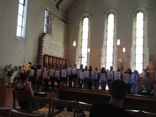 HÖREN: Wir lauschten dem Begrüßungs- und Abschiedsgottesdienst welcher mit vielen Liedern bepackt war. Während des ersten Gottesdienstes stellten sich alle anwehsenden katholischen Schulen vor - wir auch -.