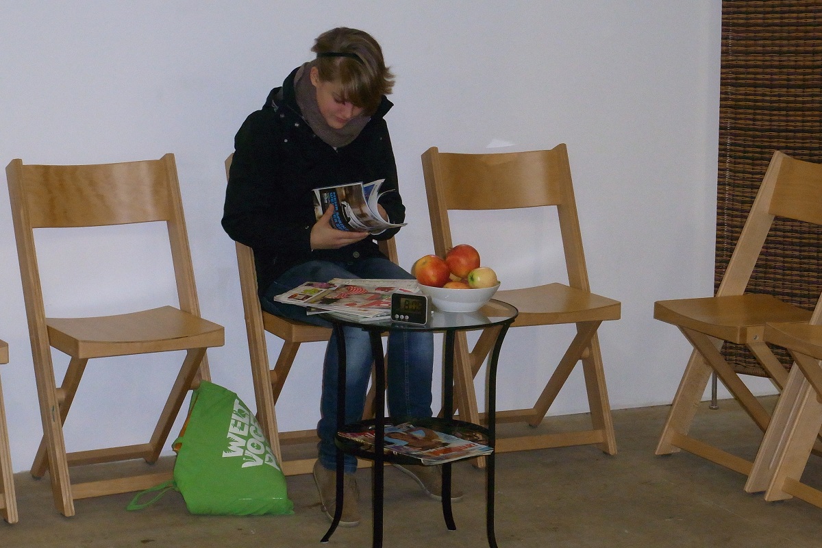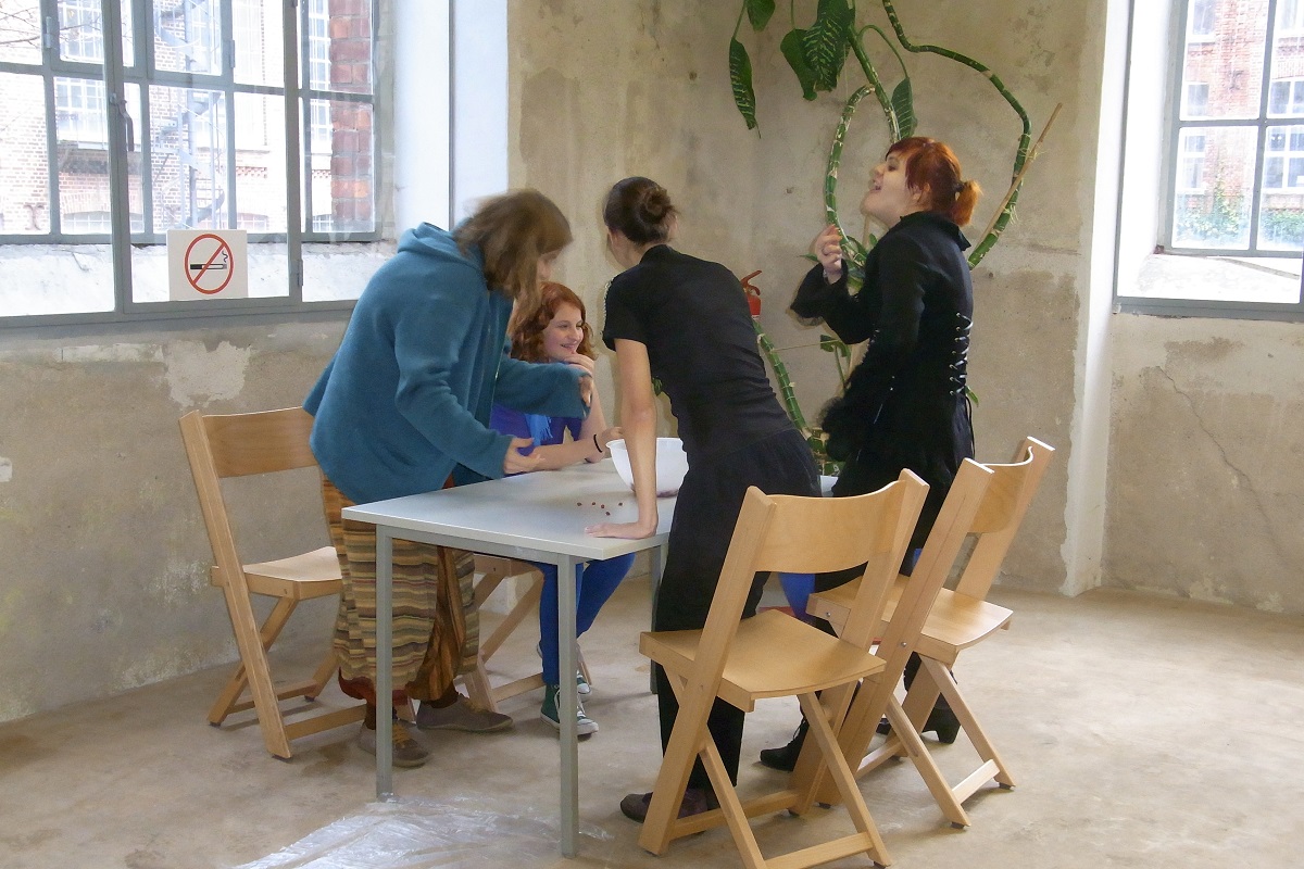 In der Ausstellung "THE POLITICS AND PLEASURES OF FOOD" (21.September bis 17.November 2013) geht es um die Esskultur und den Konsum von Lebensmitteln. Wir haben uns einige Perfomances von verschiedenen Künstlern angeschaut, z. B. von dem Polen Arti Grabowski (er begibt sich in einen Schweinestall in Anzug und Kravatte und tafelt dort gemeinsam mit den Schweinen an einer fein gedeckten Tafel, aus dem Festessen wird ein Gelage, Grabowski landet im Stroh) und uns ihnen inspirieren lassen. Denn am Ende der Woche sollten wir selbst eine Performance zum Thema Esskultur zeigen. Während einer unserer Besuche in der Spinnerei lernten wir den Künstler Jaroslav Kysa (Slowake) kennen. Er lebt und arbeitet zur Zeit für 3 Monate in Leipzig und hat uns sogar sein Atelier hier gezeigt. Er hat eine ziemlich verrückte Perfomance mit Tauben in London gemacht, welche er uns vorstellte und von seinen Erfahrungen erzählte. Anschließend haben wir uns in Gruppen überlegt, was man als Perfomance zum Thema Lebensmittelkonsum machen könnte. Am 7.11, der letzten Tag unserer Exkursionen, hat dann jede Gruppe ihre Perfomance in der Spinnerei vorgestellt. Unsere Ergebnisse könnt ihr hier sehen.